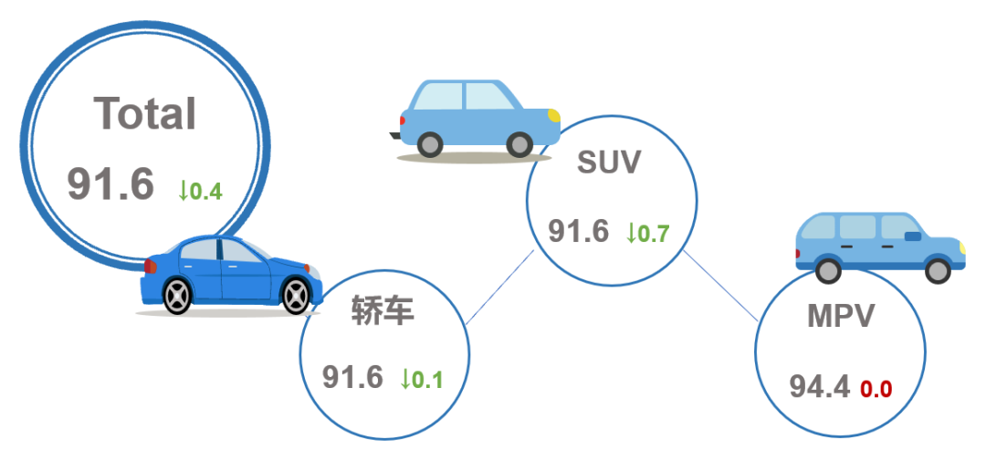 以2019年1月为基期,2022年11月整体市场产品竞争力指数为91.6,环比下滑0.4个点;从三大细分市场来看,轿车和SUV市场环比分别下滑0.1和0.7个点,MPV市场环比保持不变。