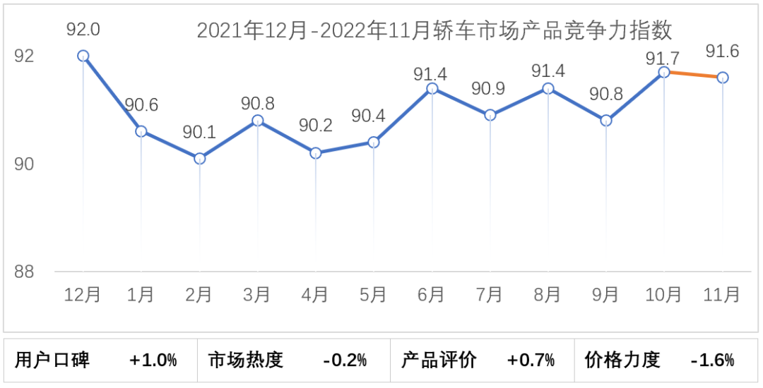 总体来看,2022年11月轿车市场产品竞争力指数为91.6,环比下滑0.1个点,其中价格力度和市场热度指标环比分别下滑1.6和0.2个点,而用户口碑和产品评价指标环比分别上升1.0和0.7个点。