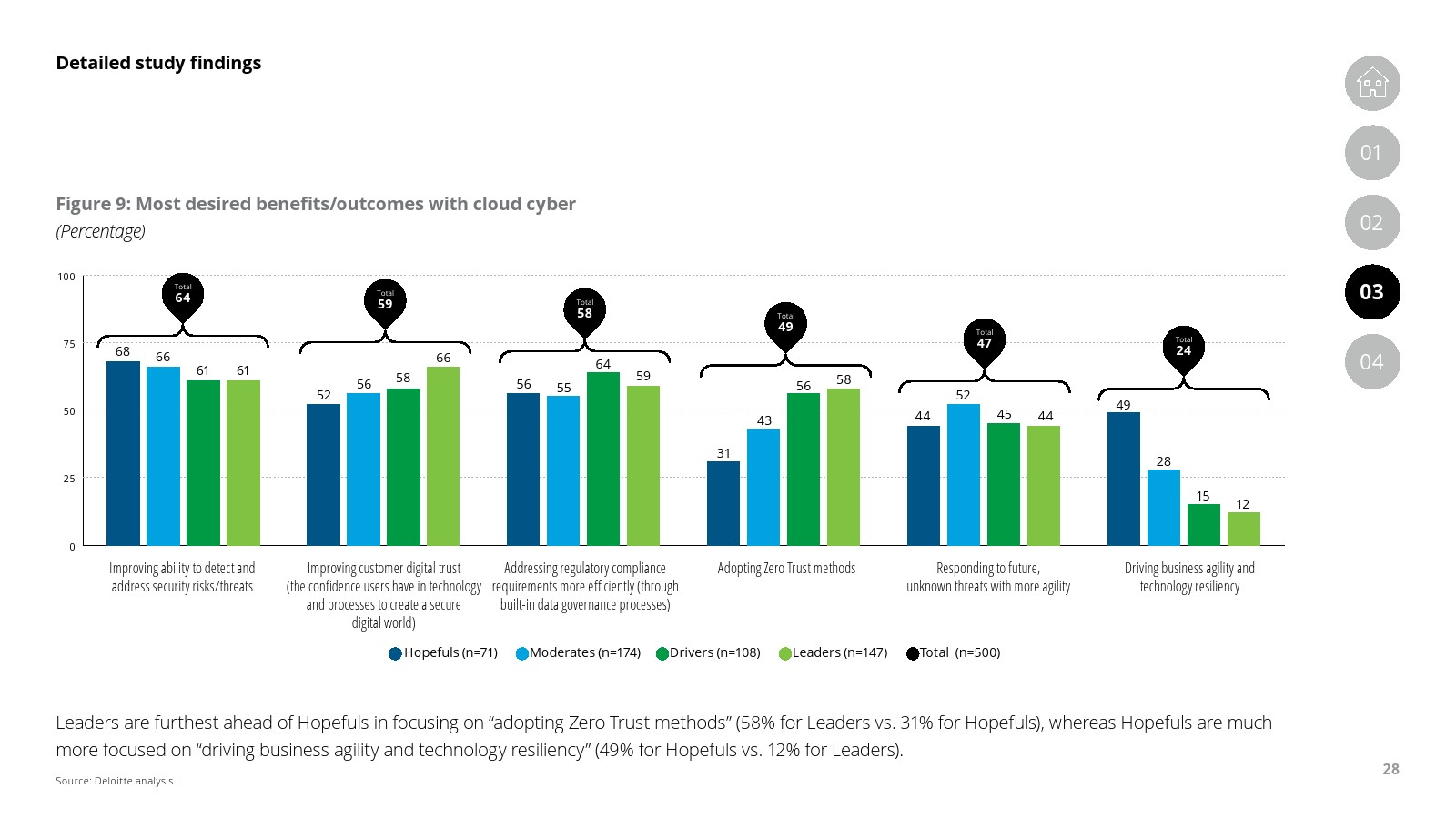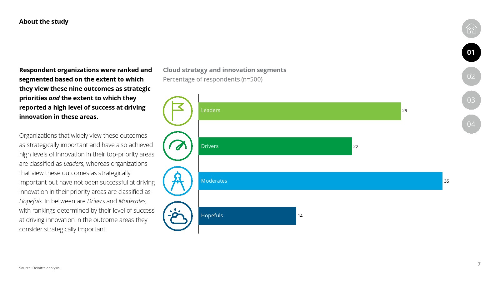 此外,作为分析的一部分,德勤根据如何回答与战略和创新相关的问题将企业分为四类:领导者(29%)、推动者(22%)、中庸者(35%)和希望者(14%)。调查发现这些类别的企业存在明显差异,但所有都显示出了一些关键趋势: