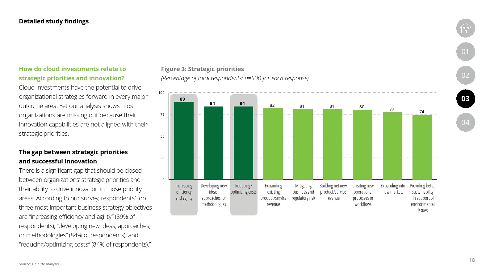 德勤的分析显示,企业陈述的业务优先事项与他们所说的在这些行业取得创新成功的表现之间平均存在 14.5 个百分点的差距。 根据德勤的调查,受访者最重要的三个业务战略目标是提高效率和敏捷性;开发新的想法、方法,以及降低或优化成本。