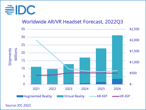 在艰难的经济环境和不断上涨的价格的支持下,IDC下调了对 2022 年剩余时间及以后增强现实(AR)和虚拟现实(VR)设备的展望。2022 年 AR 和 VR 耳机的全球出货量将下降 12.8%,降至 970 万副。由于出货量预计将同比增长 31.5%,预计 2023 年将恢复增长。而且,IDC预计未来几年AR和VR耳机将持续增长 30% 以上,到 2026 年出货量将达到 3510 万副。