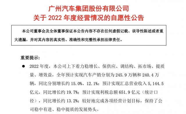 广汽集团在公告中表示,2023 年是公司高质量发展的关键之年,也是“万亿广汽”筑基之年,公司将挑战汽车产销同比增长 10%,继续保持高于行业平均水平的增长态势。