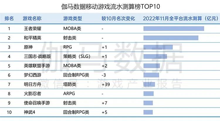 2022年11月,伽马数据移动游戏流水测算榜TOP10中,3款产品排名不变,《明日方舟》《使命召唤手游》《神武4》为新入榜产品。