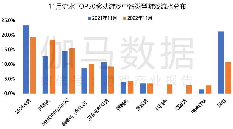 2022年11月,流水TOP50移动游戏中MOBA类流水份额排名第一,射击类、MMORPG/ARPG等流水份额高于去年同期。另外,流水TOP10类型中较去年同期新增休闲类及塔防类,其中休闲类产品为《口袋奇兵》《弹壳特攻队》,塔防类则由《明日方舟》提供增量。值得注意的是,新增品类的市场份额主要由少量头部产品支撑,品类整体的市场空间仍有待培养、释放。