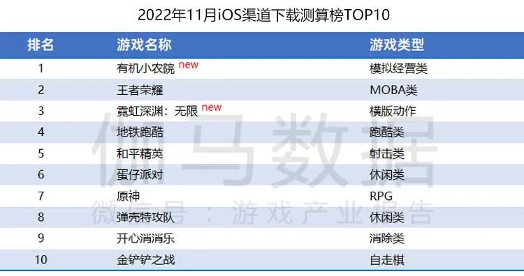 2022年11月iOS渠道下载测算榜TOP10中,新游《有机小农院》登顶,另有一款新游《霓虹深渊:无限》上榜。《霓虹深渊:无限》为单机游戏IP改编,在高度还原的基础上也对移动端进行了部分创新,该作的PC版本在Steam平台获得约1.6万名用户评价,并取得了89%的综合好评率,依托IP口碑及原作质量,手游上线后热度较高。