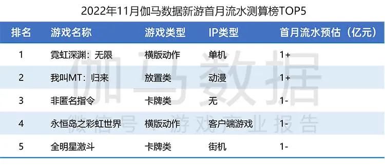 注:上述为2022年11月上线的移动游戏,并依据产品上线后30日国内全平台流水状况进行排名,上线不足30日的产品根据其目前流水状况推算首月流水。数据来源于伽马数据移动游戏流水测算,仅供参考。