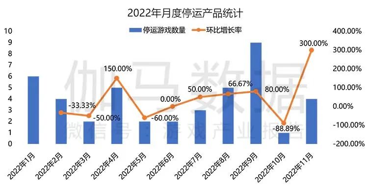 2022年11月,移动游戏产品停运数量环比增长,其中《航海日记》因运营策略调整而停运,《英雄就是我》则因与开发商协议到期停止运营。