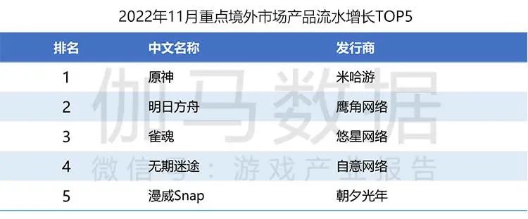 - 《原神》11月进行了3.2版本更新,凭借新角色及剧情带动实现流水强势增长。