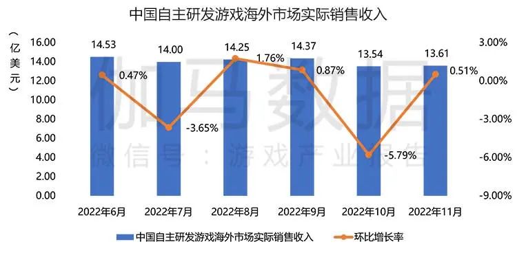 2022年11月,中国自主研发游戏海外市场实际销售收入为13.61亿美元,环比微增0.51%。版本更新、大型活动及联动活动助力产品增收,同时,结合轻度玩法的营销模式也为产品表现做出贡献。