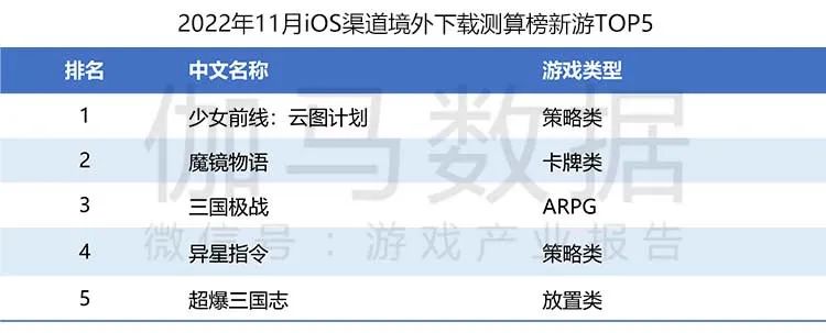 2022年11月iOS渠道境外下载测算榜新游TOP5中,“少女前线”IP游戏《少女前线:云图计划》登顶。前作《少女前线》境外市场上线后表现良好,并已稳定运营4年,为新作的全球发行奠定了基础,《少女前线:云图计划》全球英语版预下载开启即登顶免费榜,游戏上线韩国、中国台湾地区后均拿下iOS游戏免费榜第一,日版上线后则获得App Store和Google Play下载榜第一。