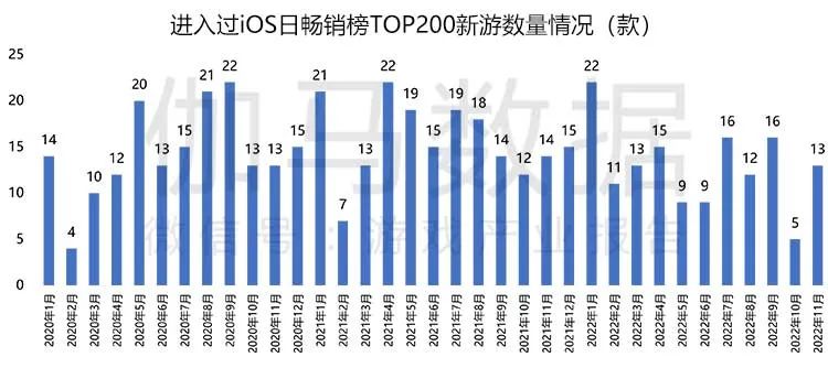 2022年11月进入过iOS日畅销榜TOP200的新游共13款,环比增长160%,与前两年同期相比较为接近。
