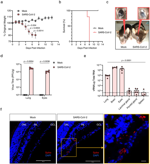 SARS-CoV-2感染小鼠眼部的临床特征和病毒滴度。图片来自Nature Communications, 2022, doi:10.1038/s41467-022-35225-1。