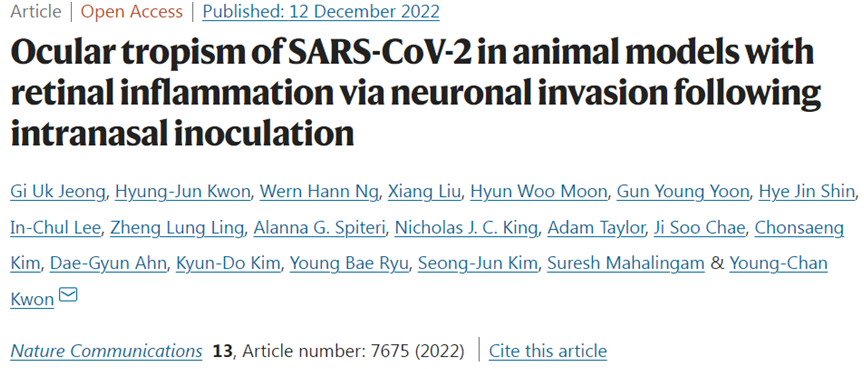 相关研究结果于2022年12月12日发表在Nature Communications期刊上,论文标题为“Ocular tropism of SARS-CoV-2 in animal models with retinal inflammation via neuronal invasion following intranasal inoculation”。