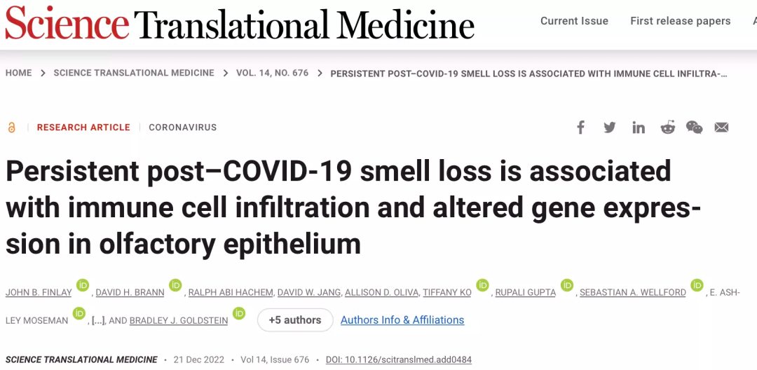 在美国杜克大学团队的研究团队不懈努力下,终于揭开了“新冠感染后长期嗅觉丧失”的谜底——即使组织中的新冠病毒已经被消除,但T细胞介导的炎症依然存在于嗅觉上皮中,对嗅觉神经细胞进行持续的免疫攻击;此外,由于持续的炎症损害,“脆弱”的嗅觉感觉神经元的数量显著减少,自然会导致持续的嗅觉丧失。该研究于12月21日发表在Science子刊Science Translational Medicine上。