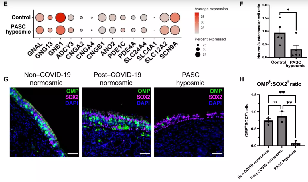 scRNA-seq量化后的数据显示:与对照组相比,PASC组中嗅觉感觉神经元的数量显著降低。具体来说,可使用抗嗅觉标记蛋白(OMP)抗体标记的神经元数量下降,而成熟嗅觉感觉神经元与支持细胞的比例也显著降低。