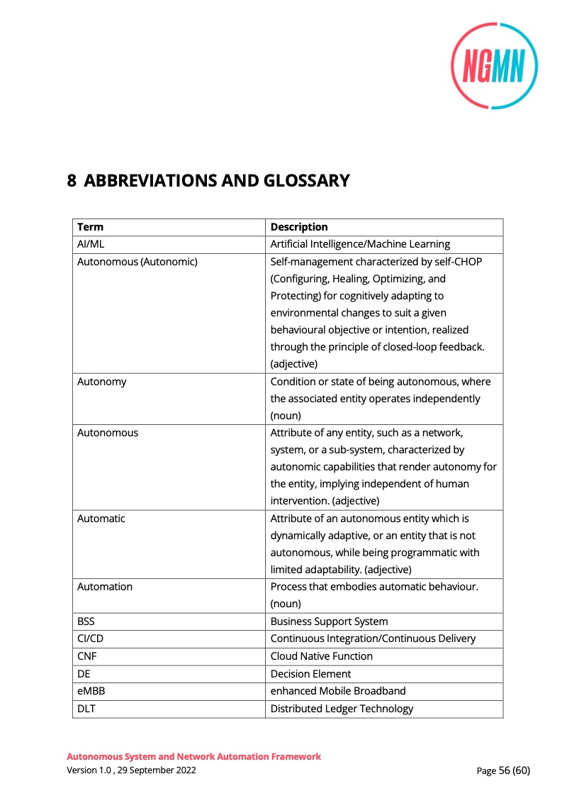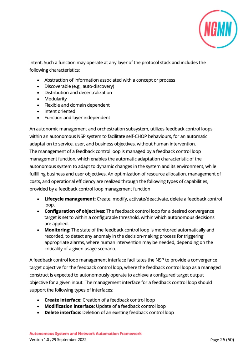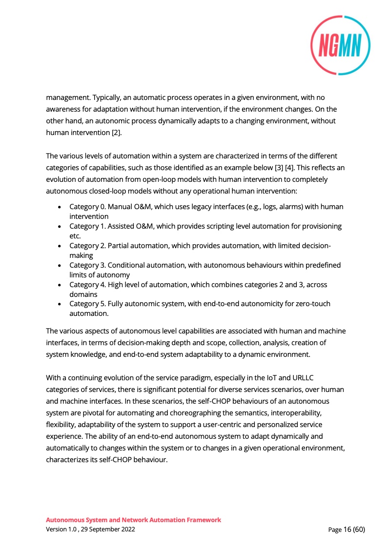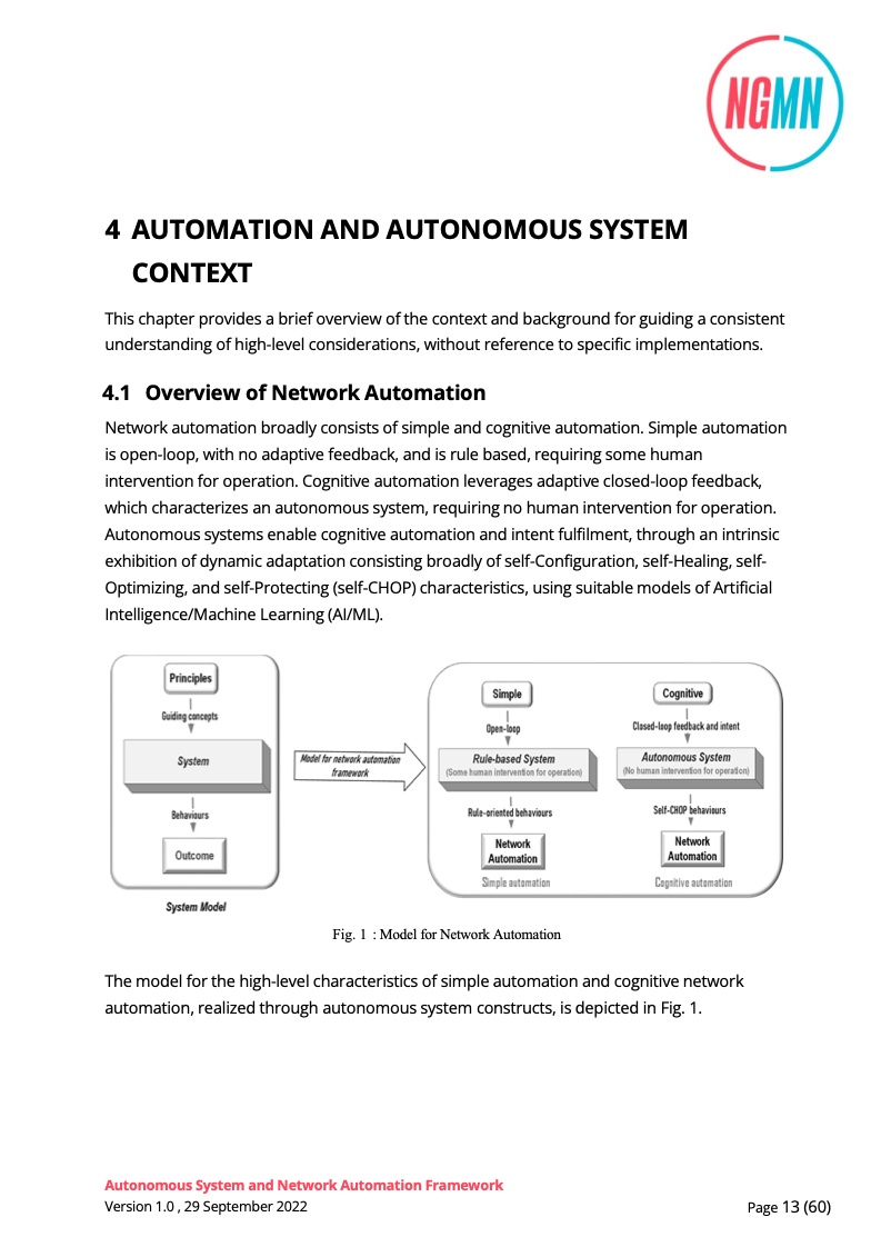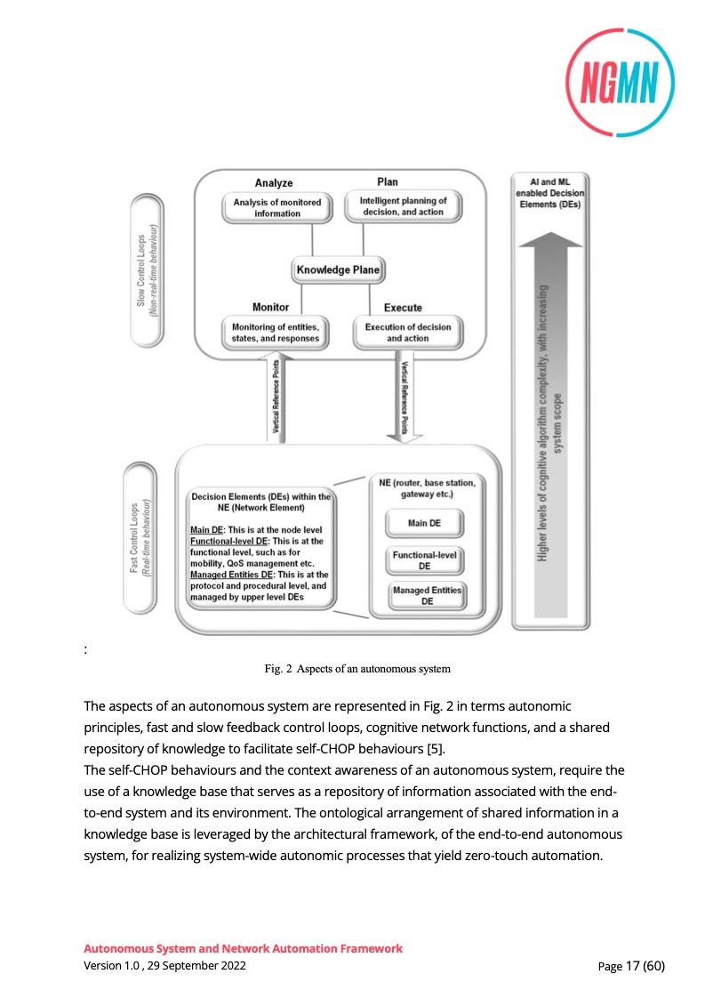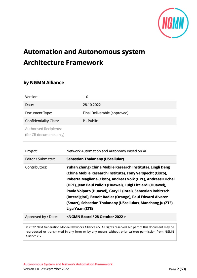 近日,中国移动研究院牵头,联合德国电信、UScellular、Orange、HUAWEI、HPE等十余家国际主流运营商与国际主流厂商在NGMN(Next Generation Mobile Networks Alliance, 下一代移动通信网络联盟)正式发布《自动化与自智系统架构》(Automation and Autonomous system Architecture Framework)白皮书,基于网络自动化现状与智能化平台扩展需求,提供自智网络平台实现参考架构与互通标准,为开源与标准等产业组织的工作规划提供建议。