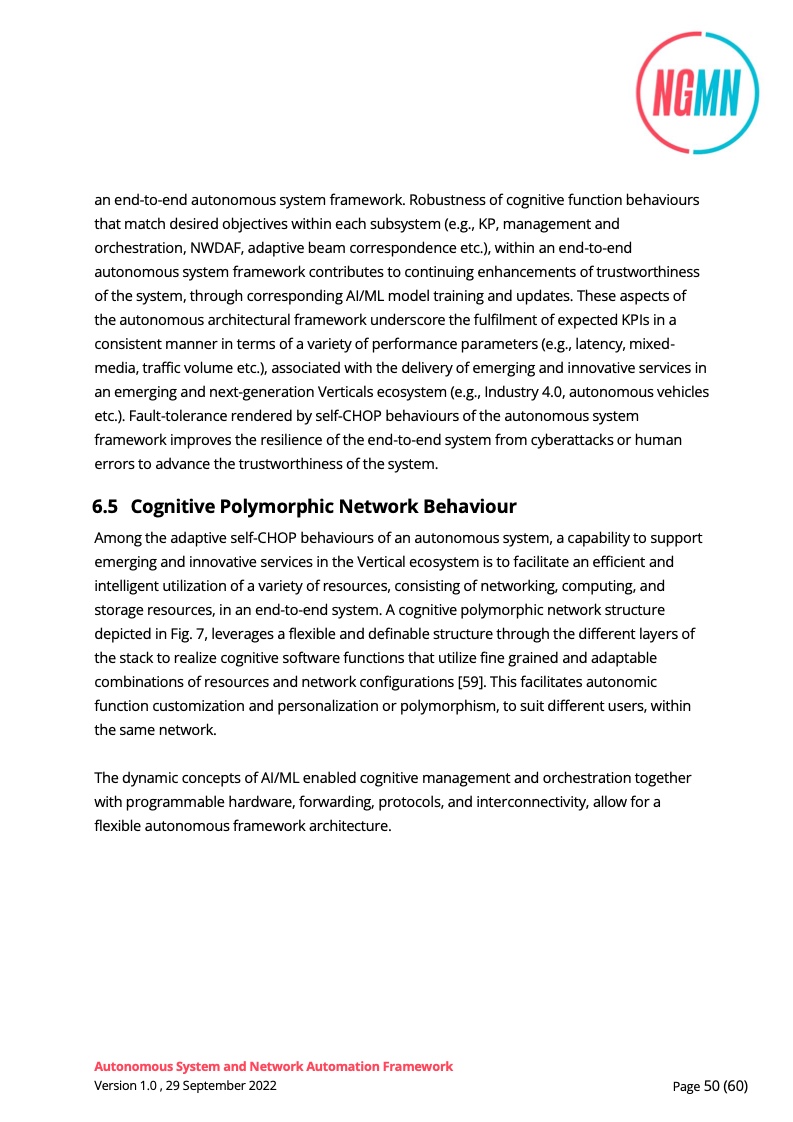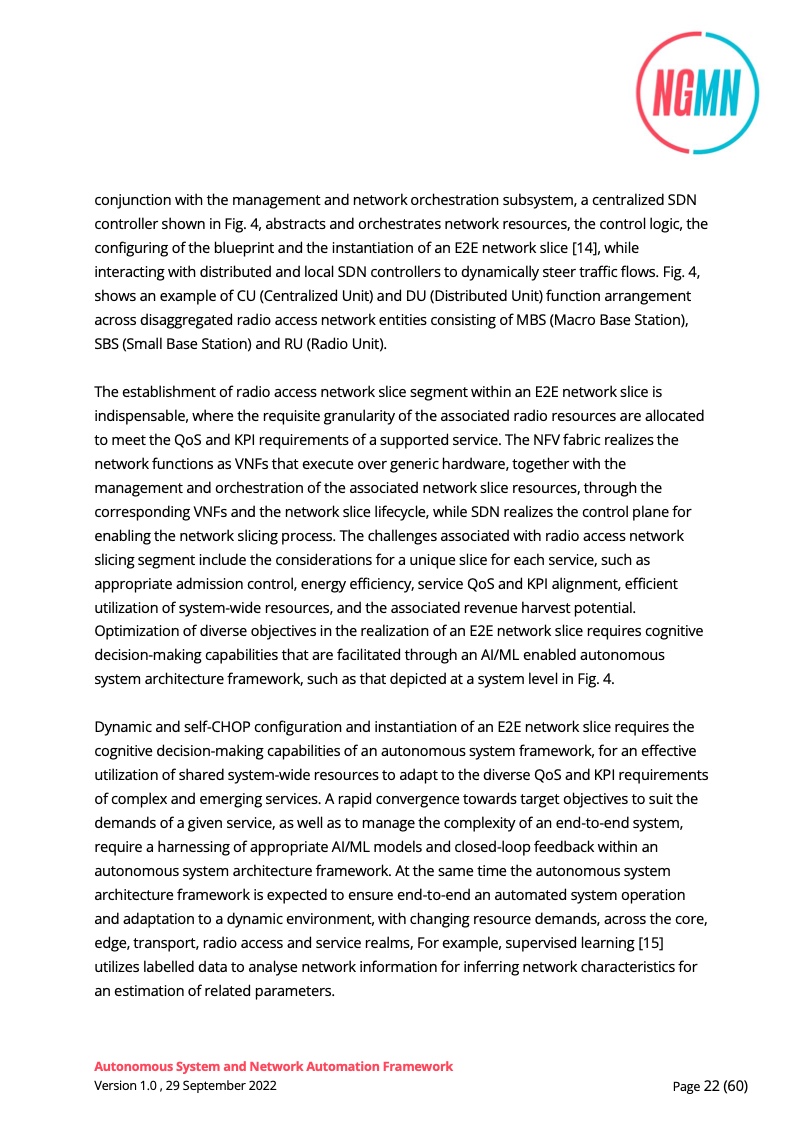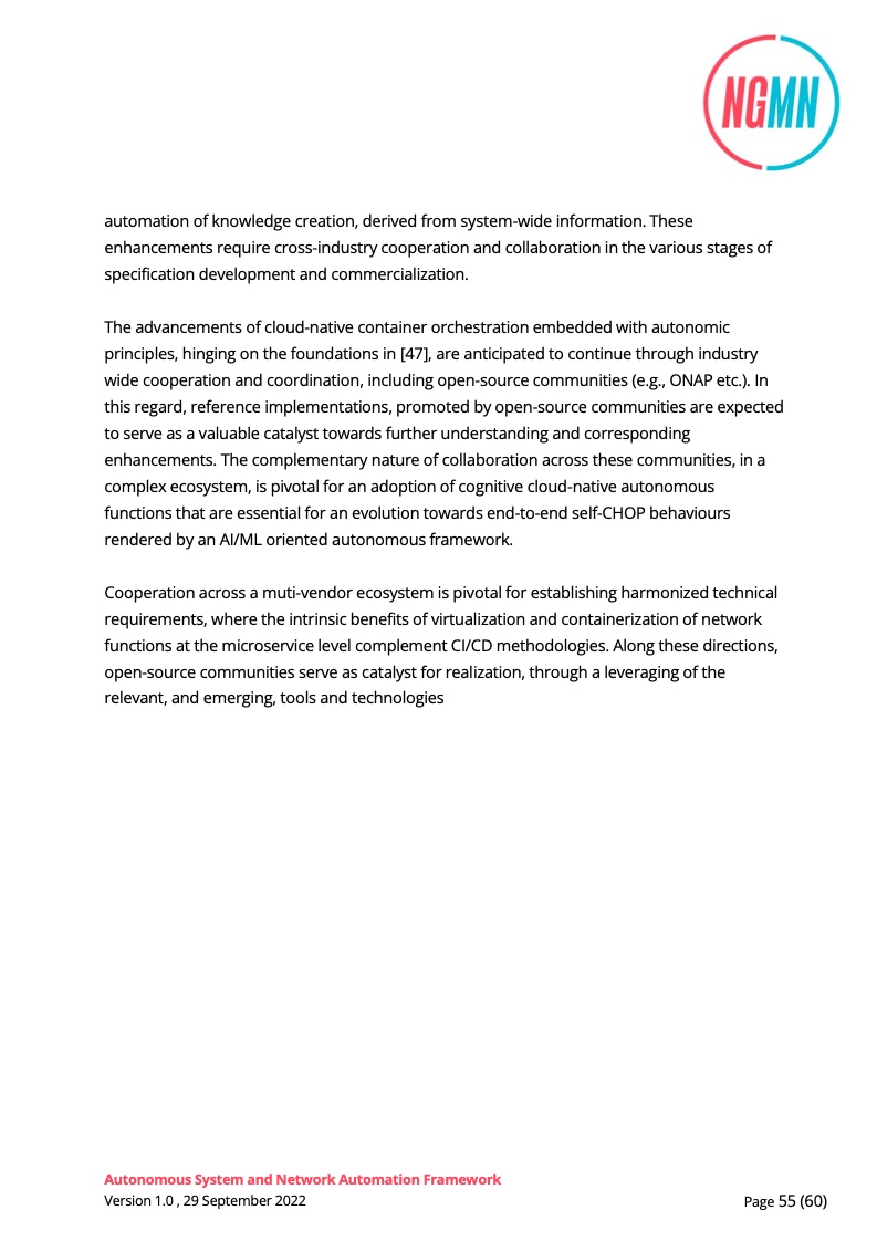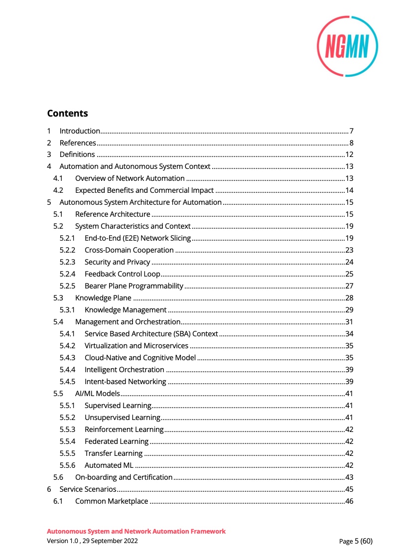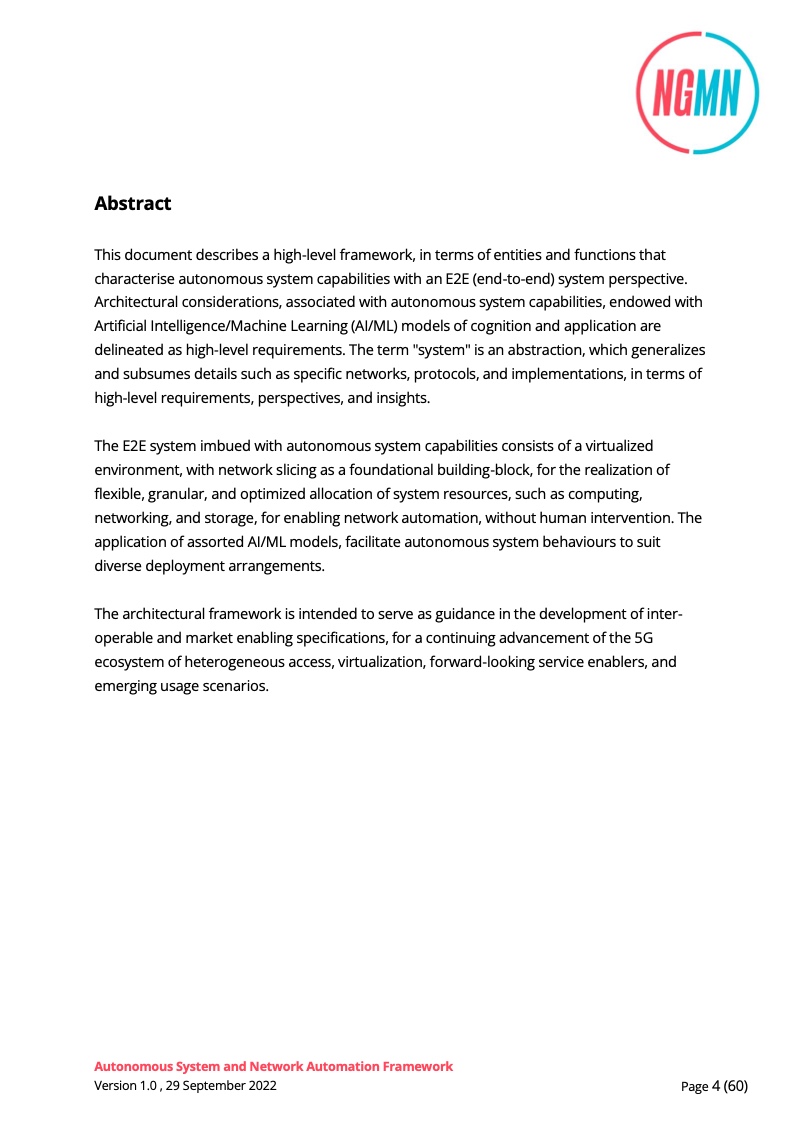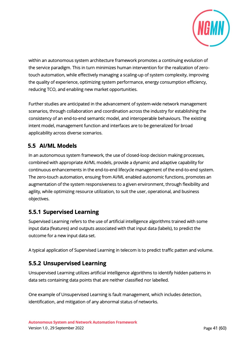 白皮书包括四部分内容:一是介绍了自智网络的总体概念与其商业效益;二是分析了自智网络系统参考架构,强调通过知识自动化来实现自智网络的编排与管理;三是介绍了自智网络系统中广泛使用的AI/ML算法模型与自智网络的服务场景;四是分析了目前产业潜在差距并给出NGMN的开源标准组织的协作现状及建议。