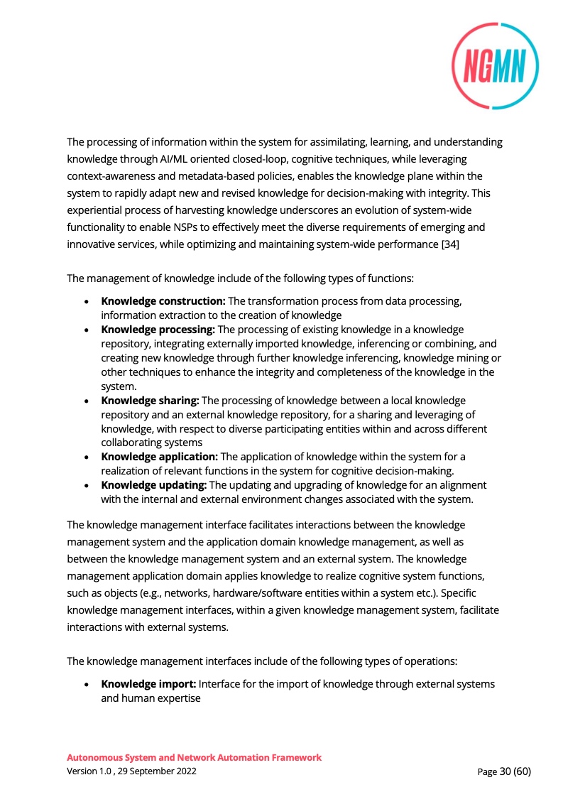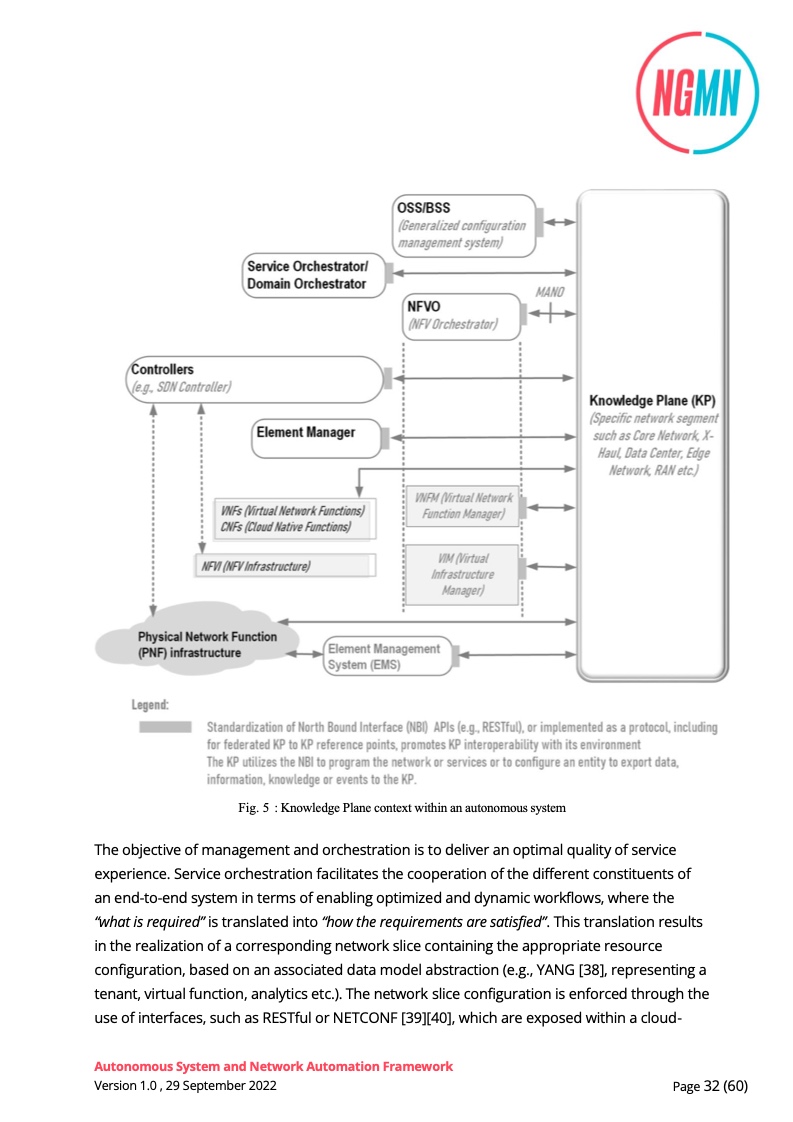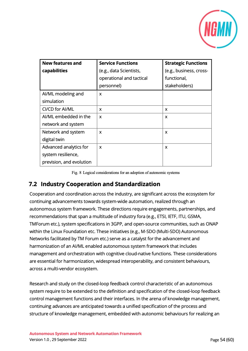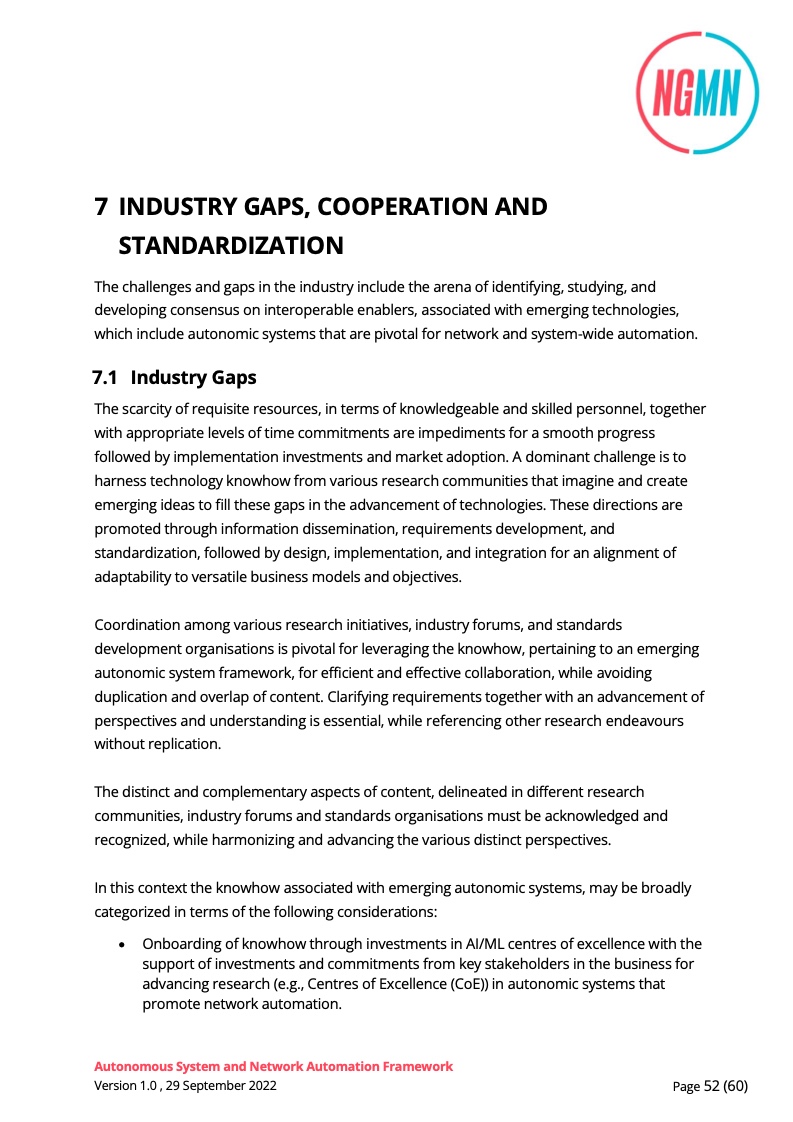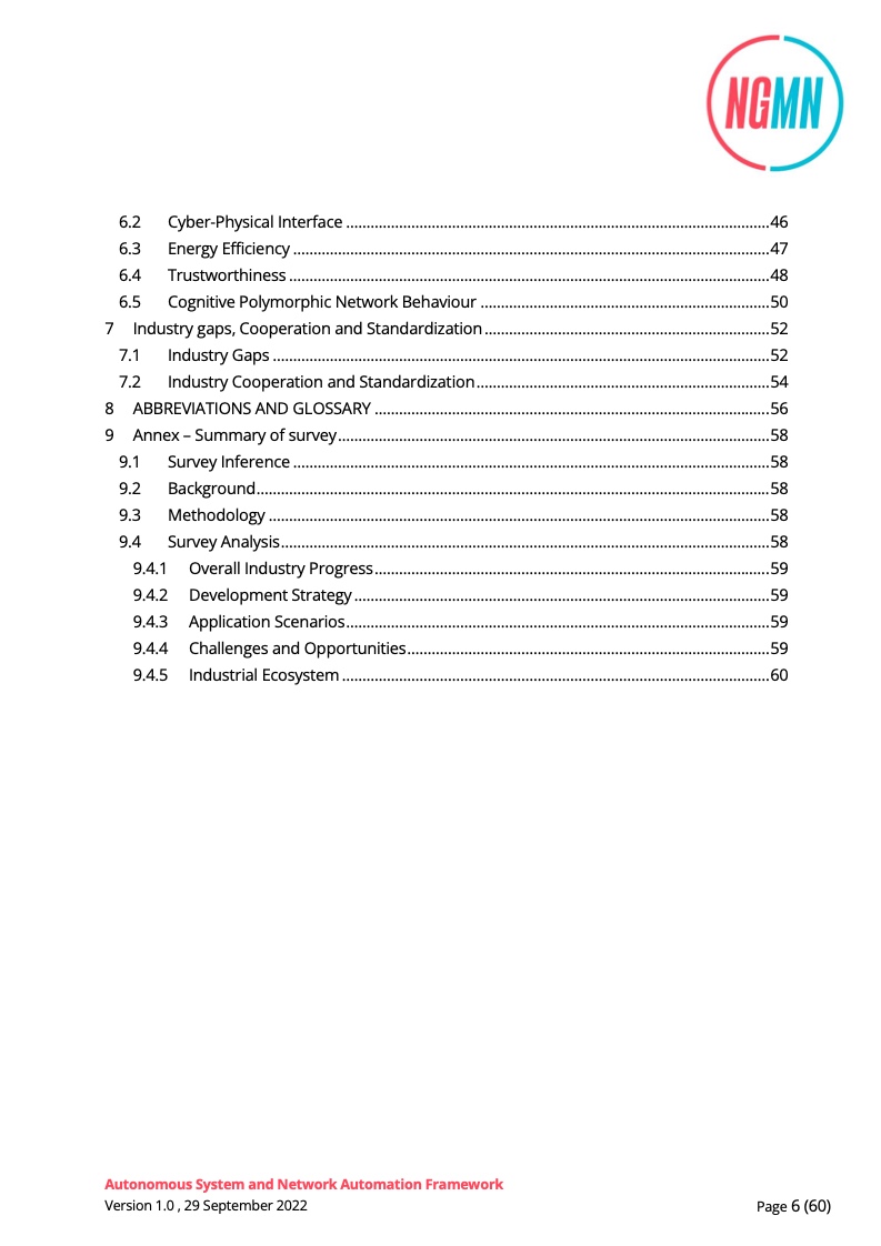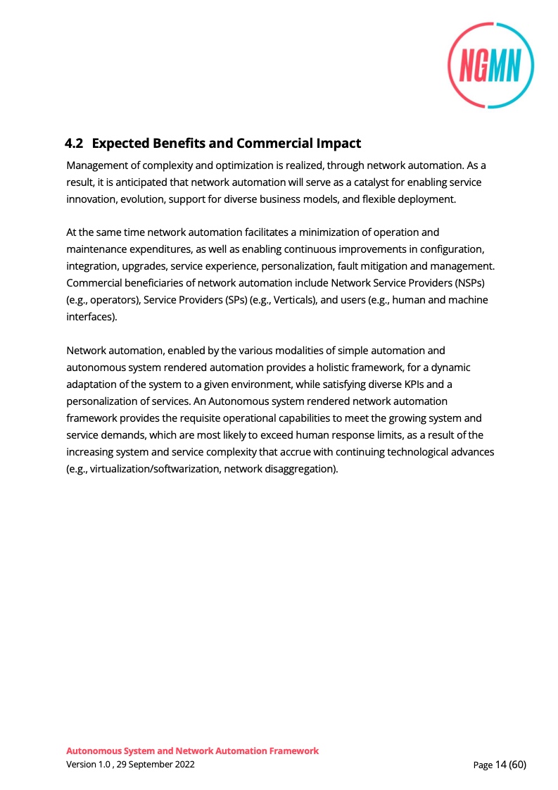 白皮书包括四部分内容:一是介绍了自智网络的总体概念与其商业效益;二是分析了自智网络系统参考架构,强调通过知识自动化来实现自智网络的编排与管理;三是介绍了自智网络系统中广泛使用的AI/ML算法模型与自智网络的服务场景;四是分析了目前产业潜在差距并给出NGMN的开源标准组织的协作现状及建议。