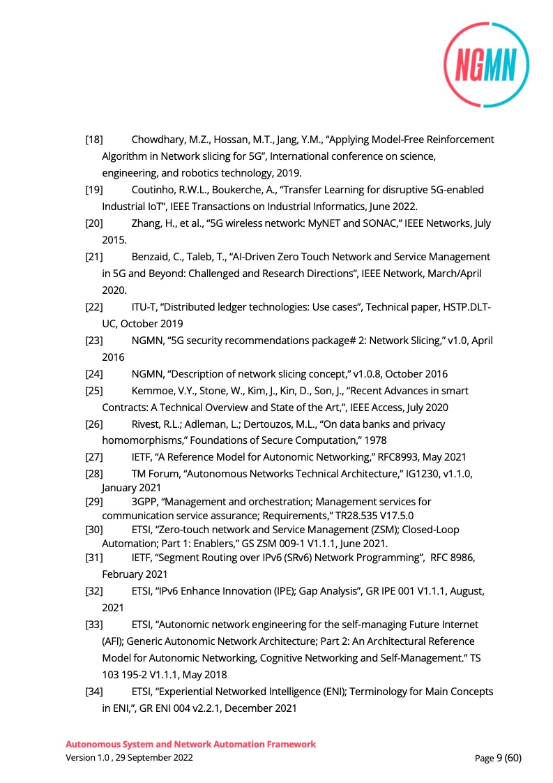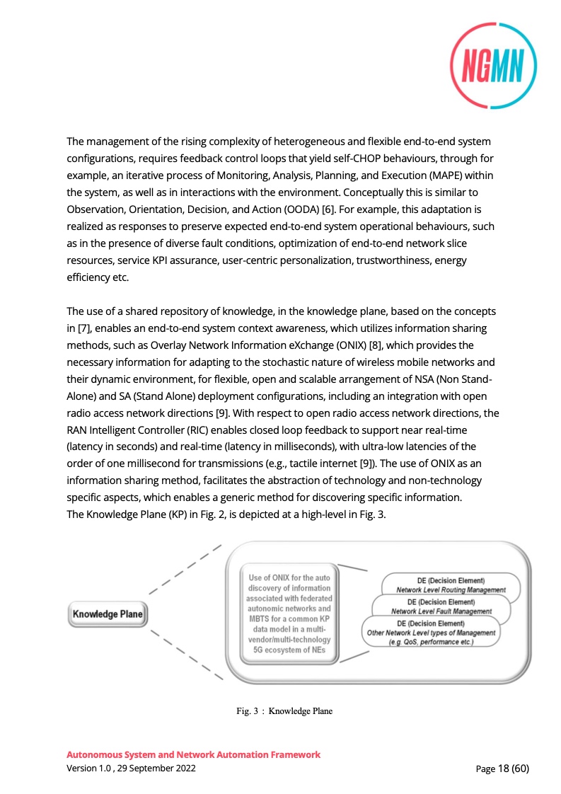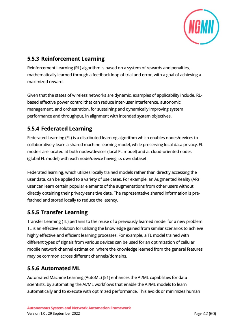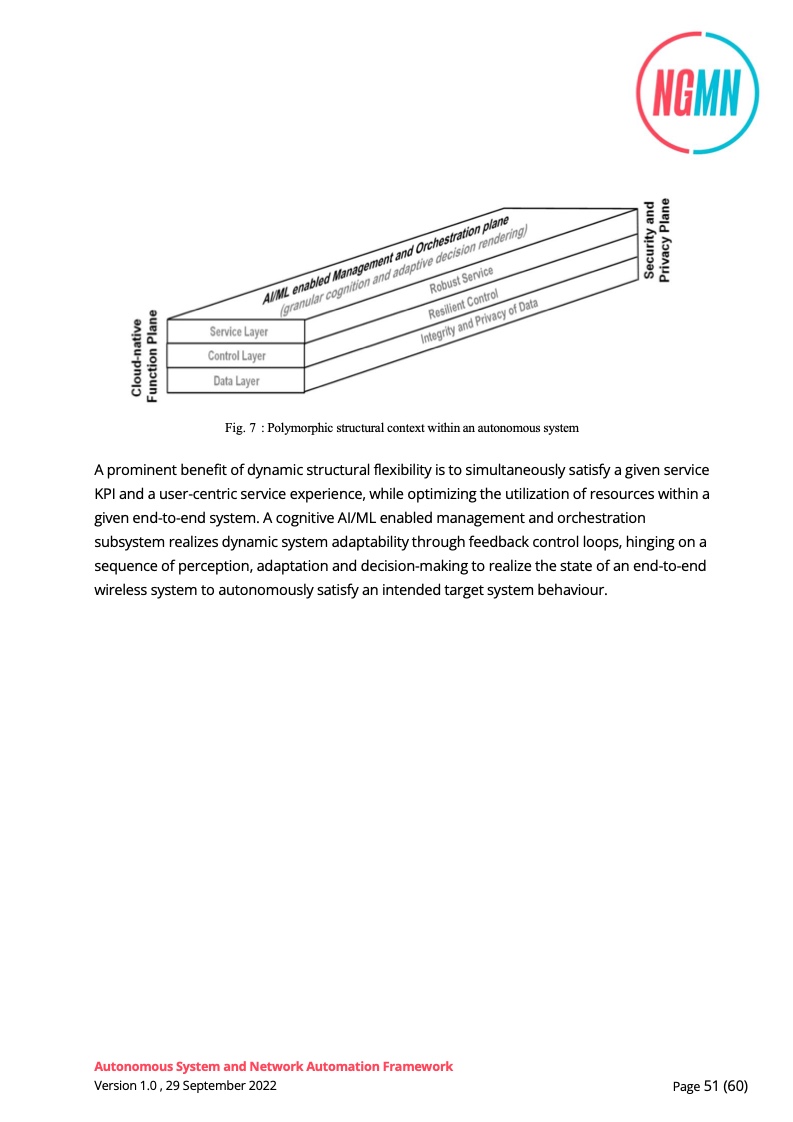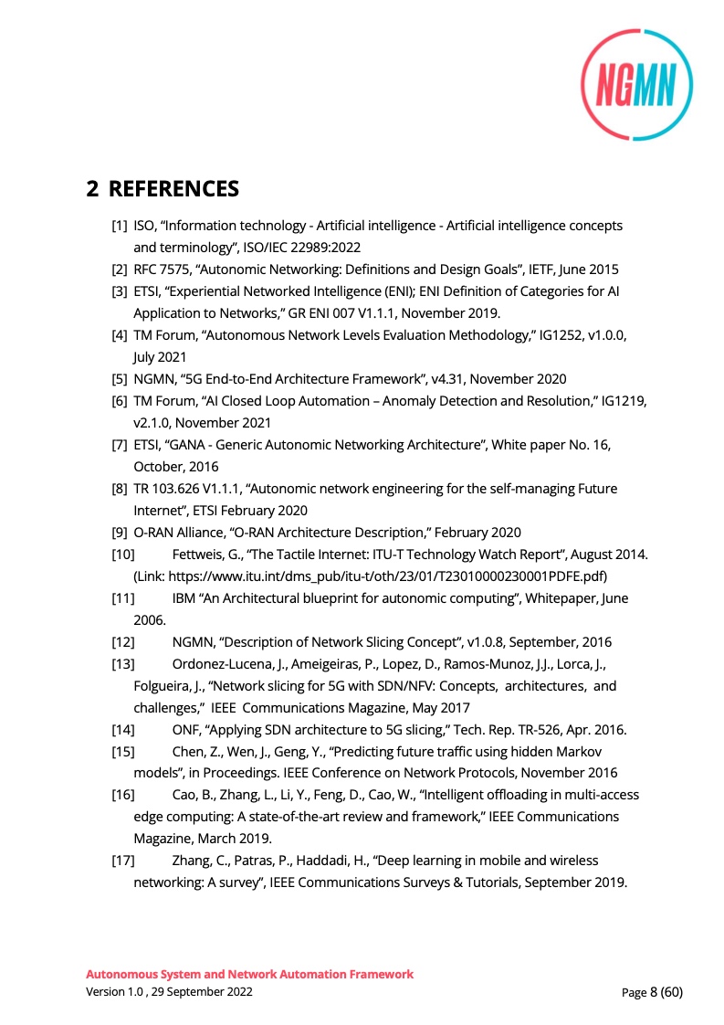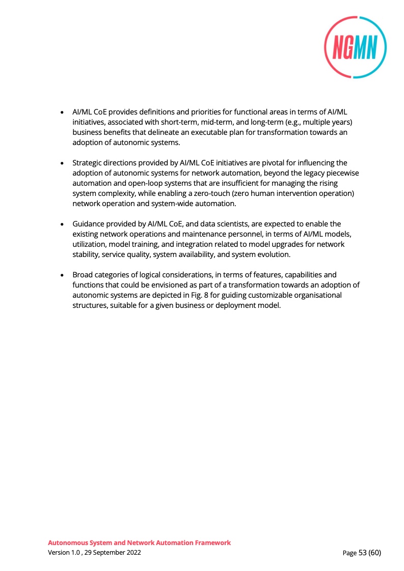 白皮书包括四部分内容:一是介绍了自智网络的总体概念与其商业效益;二是分析了自智网络系统参考架构,强调通过知识自动化来实现自智网络的编排与管理;三是介绍了自智网络系统中广泛使用的AI/ML算法模型与自智网络的服务场景;四是分析了目前产业潜在差距并给出NGMN的开源标准组织的协作现状及建议。
