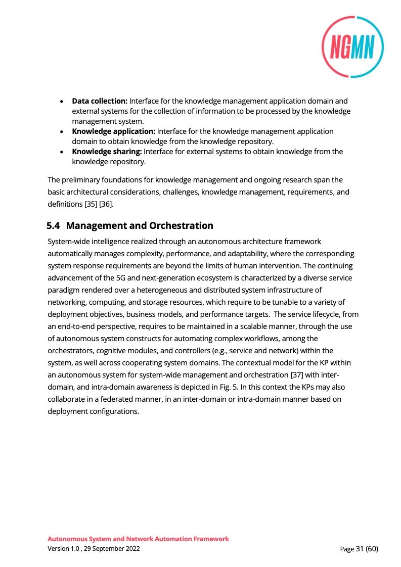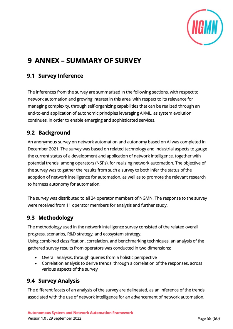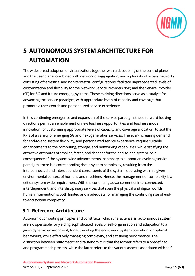 2021年针对运营商的自智网络数智化转型战略与挑战等,项目组在NGMN发布自智网络需求调研问卷与问卷调研研究报告。以此为基础,今年12月发布《自动化与自智系统架构》白皮书,旨在研究统一自智网络技术体系架构、进一步深化产业共识、加速AI注智自智网络建设。