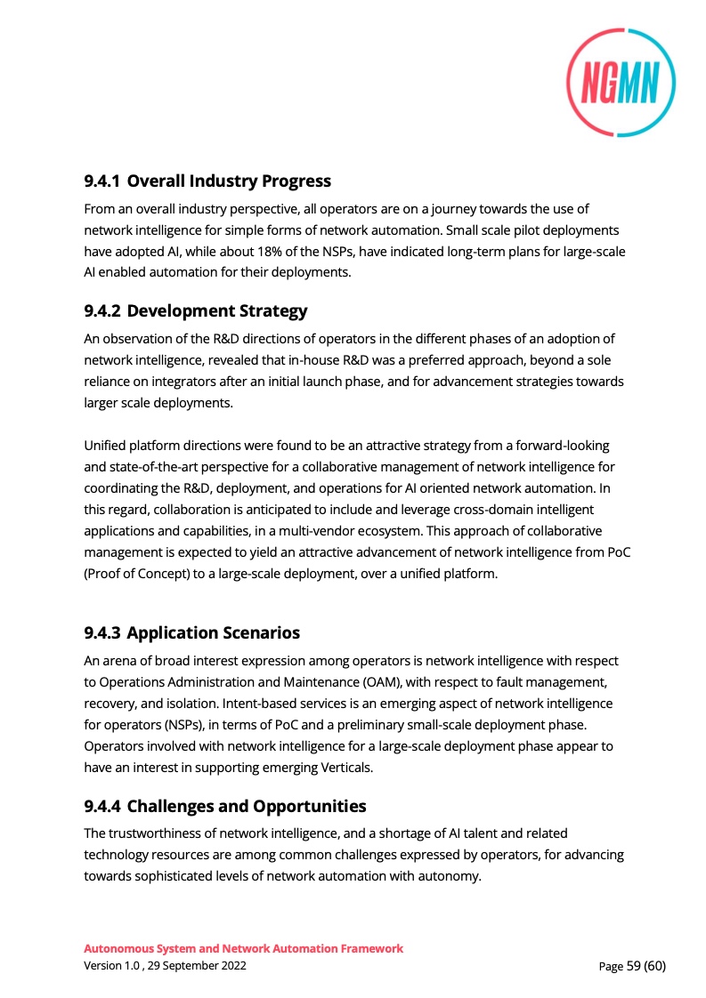 中国移动研究院2021年1月牵头并联合德电、UScellular等多家国际领先运营商在NGMN成立基于AI的网络自动化与自智(Network Automation and Autonomy based on AI)项目组,针对5G+时代通信网络运维管理自动化与智能化进行深入研究,包括自智网络的产业现状、系统架构、功能特性与服务场景,重点关注如何使用人工智能/机器学习 (AI/ML)技术促进网络管理与部署灵活性,以实现零故障、零接触、零等待的端到端自动化网络运维。