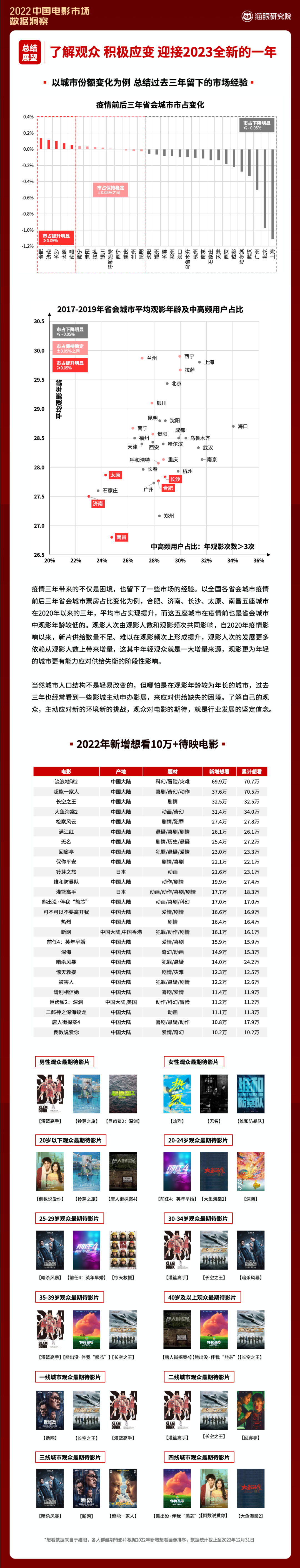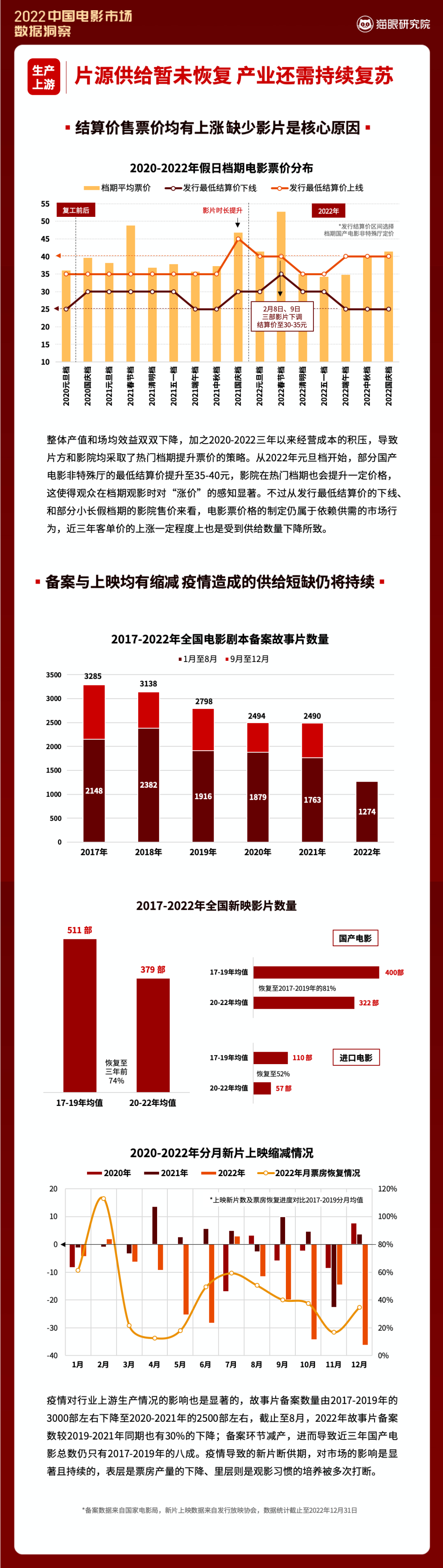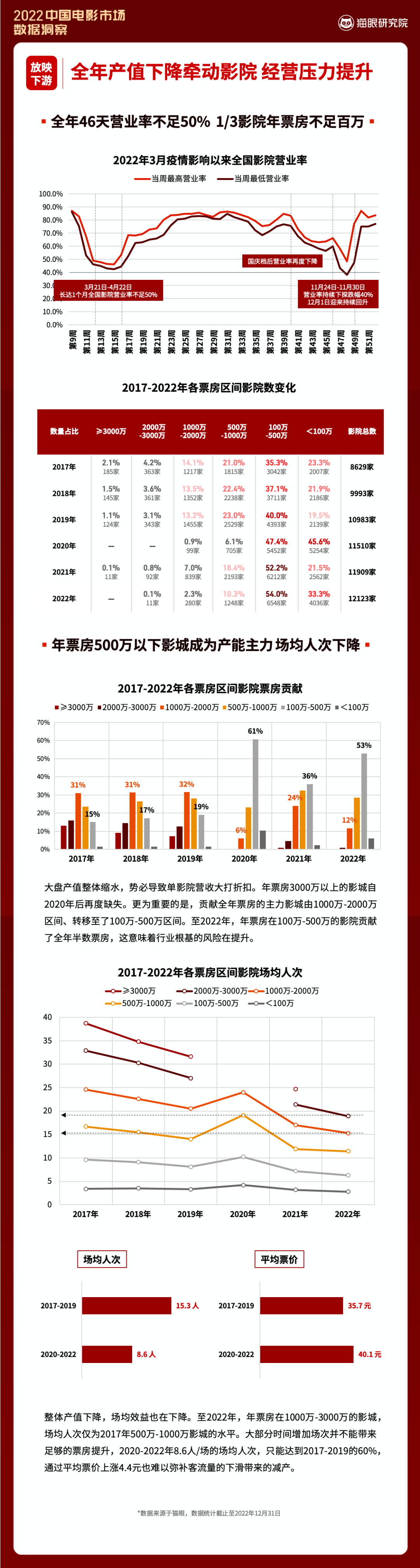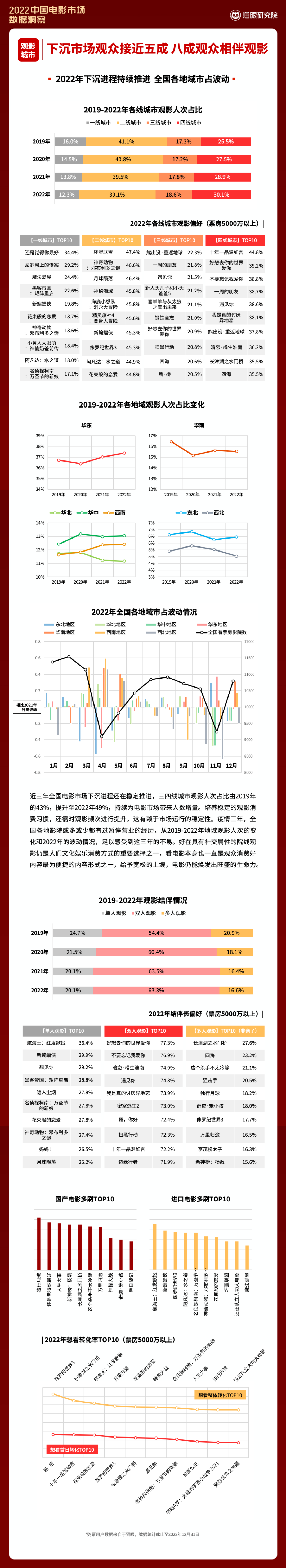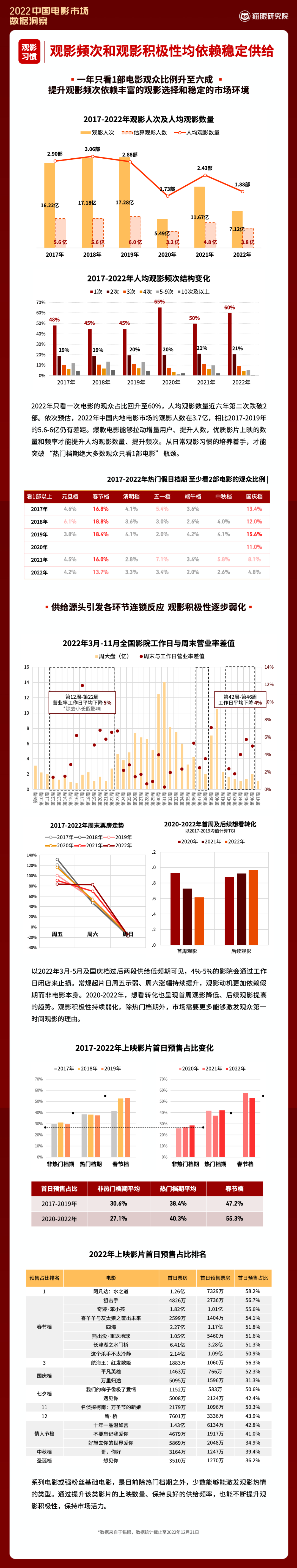 猫眼研究院:2022中国电影市场数据洞察 更多阅读:猫眼研究院:春节档新片总票房(含点映)破亿!猫眼研究院:2023年度票房破250亿猫眼研究院:2021年度电影票房榜–TOP10国产电影占据8部猫眼研究院:2022国庆档总票房14.9亿猫眼研究院:2022年中秋节票房破1.4亿猫眼研究院:2023年五一档数据洞察猫眼研究院:2022年短剧热度榜猫眼研究院:2022国庆档数据洞察猫眼研究院:《阿凡达2》进入2022全球票房榜第10位猫眼研究院:2022年贺岁档票房破6亿猫眼研究院:2023端午档总票房8.92亿猫眼研究院:2022贺岁档总票房破10亿猫眼研究院:2023年5月猫眼「电视剧」热度榜猫眼研究院:2023年2月总票房破30亿猫眼研究院:2023年5月总票房破30亿