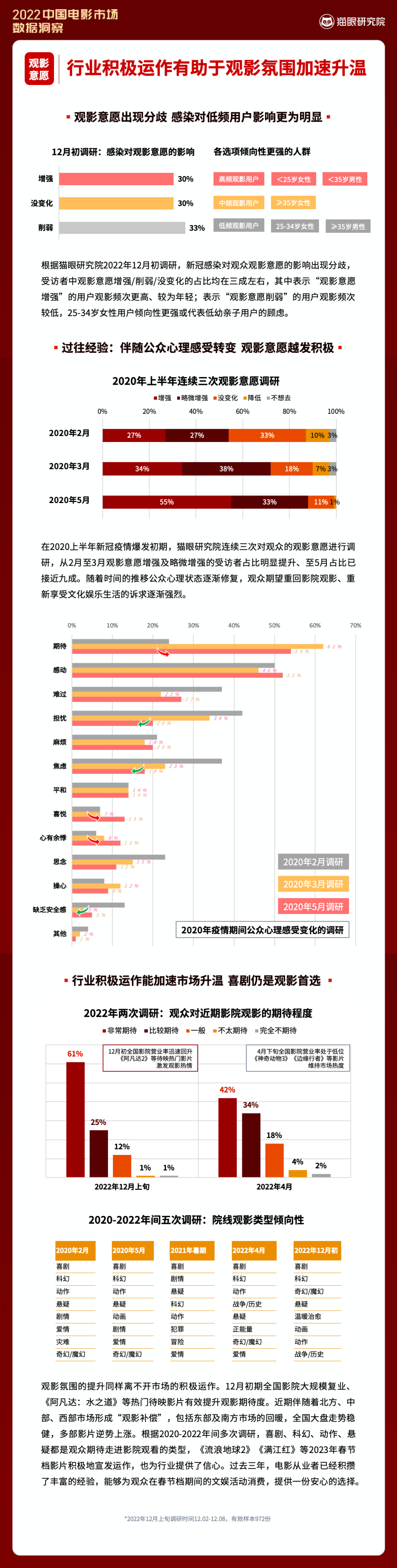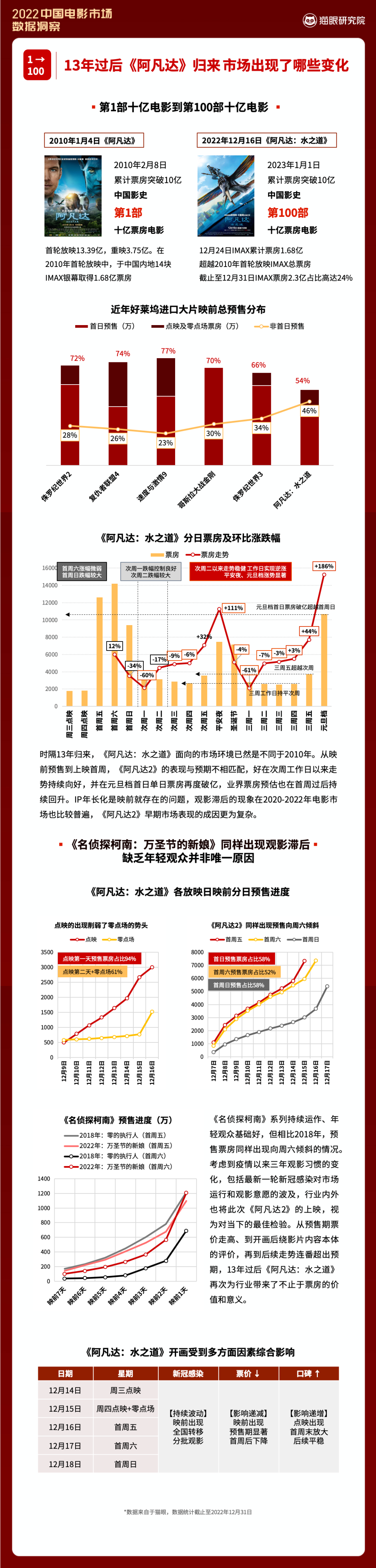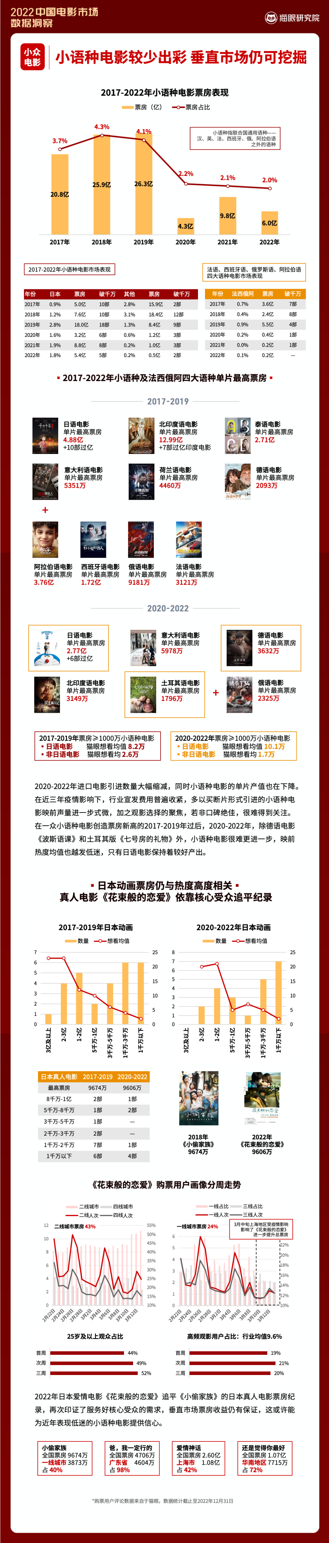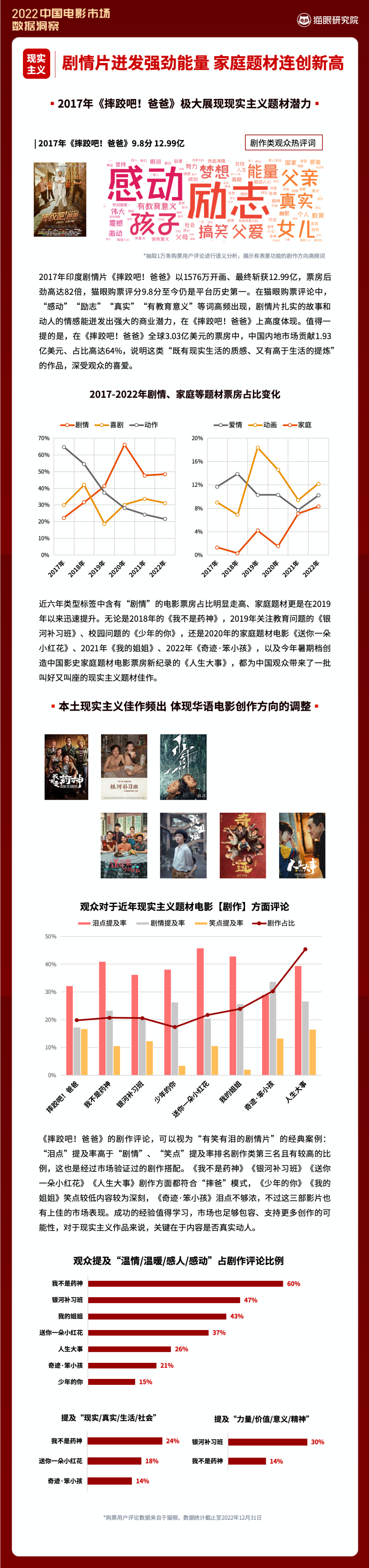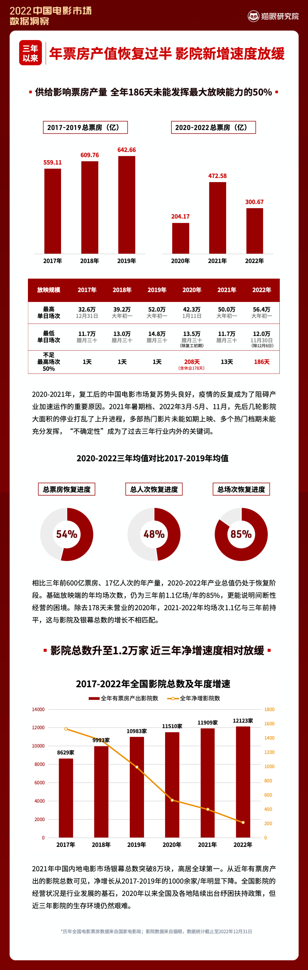 猫眼研究院:2022中国电影市场数据洞察 更多阅读:猫眼研究院:春节档新片总票房(含点映)破亿!猫眼研究院:2023年度票房破250亿猫眼研究院:2021年度电影票房榜–TOP10国产电影占据8部猫眼研究院:2022国庆档总票房14.9亿猫眼研究院:2022年中秋节票房破1.4亿猫眼研究院:2023年五一档数据洞察猫眼研究院:2022年短剧热度榜猫眼研究院:2022国庆档数据洞察猫眼研究院:《阿凡达2》进入2022全球票房榜第10位猫眼研究院:2022年贺岁档票房破6亿猫眼研究院:2023端午档总票房8.92亿猫眼研究院:2022贺岁档总票房破10亿猫眼研究院:2023年5月猫眼「电视剧」热度榜猫眼研究院:2023年2月总票房破30亿猫眼研究院:2023年5月总票房破30亿
