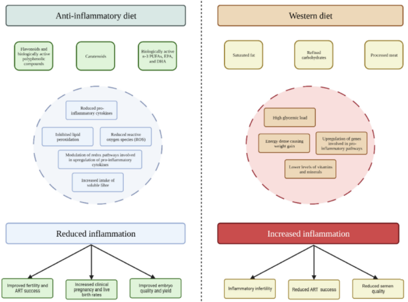 ▲抗炎饮食、西方饮食分别影响炎症水平和生育功能的作用机制(图片来源:参考资料[9])