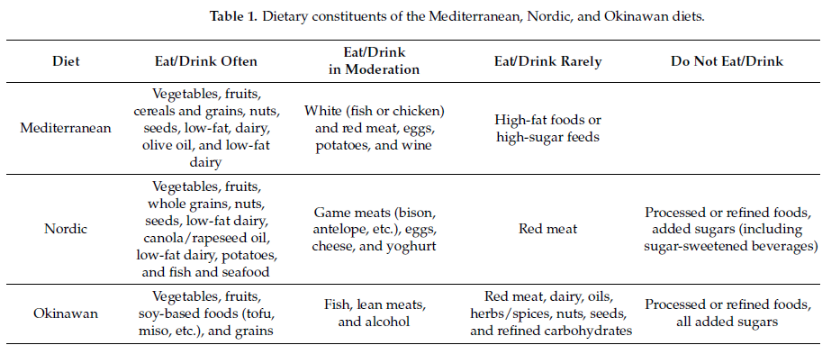 ▲三种主要抗炎饮食(地中海、北欧和冲绳饮食)的特征(图片来源:参考资料[9])