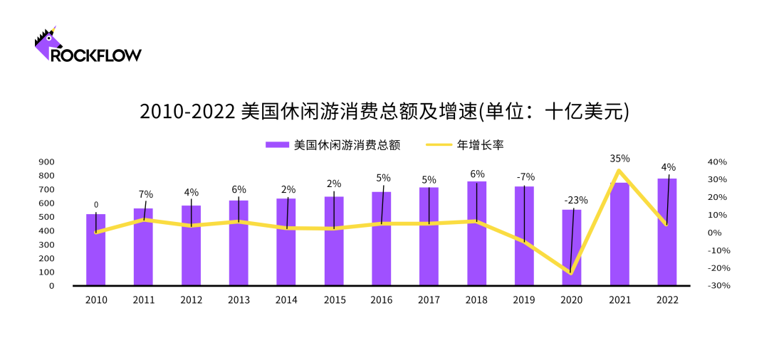 从图可以看出,美国休闲游消费总额保持增长的趋势,但是相较于2020-2021,增速已经从35%放缓至4%。这是因为2020-2021是触底反弹式的增速,在高基数下,2022的增速已经慢慢恢复常态。