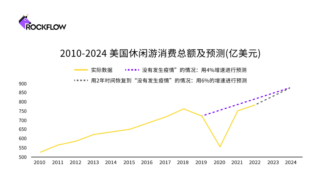 休闲游是一个比较稳定的行业。如果从休闲游消费总额来看,2010-2019年的年增长率稳定在4%。如果没有发生疫情,按4%的增长率来进行预测,2023年美国境内消费总额应该达到844亿美元。由于全球疫情管控基本已经放开,乐观情况下,假设美国境内消费总额用2年时间恢复到“没有发生疫情”的规模,则需要年增速6%来支持。