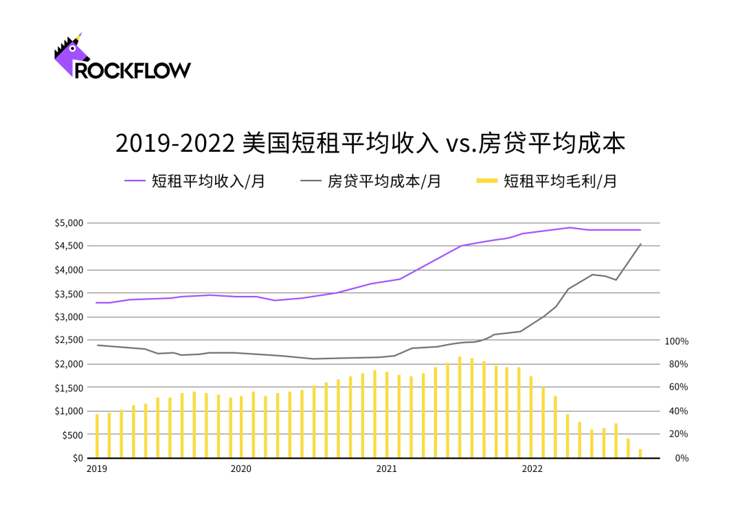 虽然2022年Q3的供给增长非常乐观,但供给的数据不会持续如此高规模增长,因为美联储加息后,利率的提高导致购买房屋的成本增加,购置新房后再出租的毛利率下降。根据AirDNA数据显示,每个月的贷款成本和短租的收入之间的差额,从2022年开始一路下滑,从$1500滑落至$300左右。这意味着,如果房东在今天贷款购入一套公寓并马上出租,每个月只能获得$300美金的利润,而在一年前这个数字是$1500。