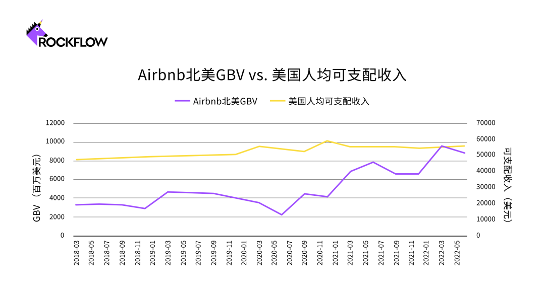 如果将美国个人可支配收入和Airbnb的北美地区GBV进行比较,从18-20年都处于比较稳定的比例,然而从21年开始,GBV猛增,在22年3月开始回落。从增速上来看,2018年6月至2022年6月,美国个人可支配收入增长17%,而Airbnb的GBV同期增长163%,目前开始回落。