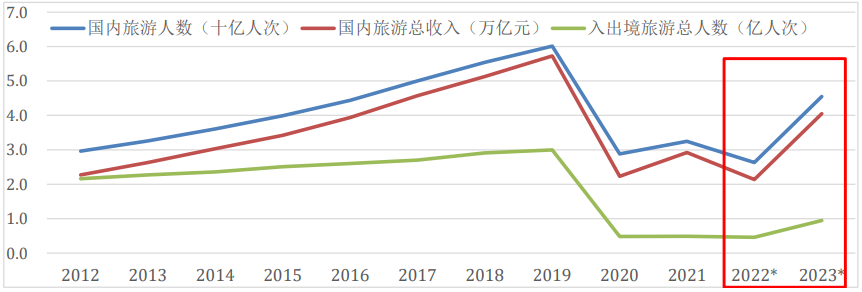 12月26日,国务院联防联控机制发布《关于印发对新型冠状病毒感染实施“乙类乙管”总体方案的通知》,自2023年1月8日起,对新型冠状病毒感染实施“乙类乙管”,围绕“保健康、防重症”,采取相应措施,最大限度保护人民生命安全和身体健康,最大限度减少疫情对经济社会发展的影响。政策千万条,市场第一条。只要终结了城乡居民流动和接触性消费的限制措施,加上预期内的感染高峰过后,城乡居民的出游意愿很可能于第一季度末由“谨慎”转向“积极”。我们有理由将2023年旅游经济预期由“谨慎乐观”上调为“乐观”,全年将呈现“稳开高走,加速回暖”的态势,季度增速有望环比走高。受探亲访友、民俗休闲、亲子研学、冰雪和避寒需求增长的拉动,即将到来的春节假期将成为疫情以来最值得期待的春节旅游市场。清明节、端午节、劳动节假日旅游需求,加上商务旅行的刚性增长,第二季度旅游市场将进入预期转强和供给优化的新通道,暑期则有望迎来全面复苏,避暑旅游很可能接近甚至达到疫情同期水平。预计2023全年国内旅游人次和国内旅游收入恢复至疫前的70-75%,入出境旅游人次有望恢复到疫前的三到四成。