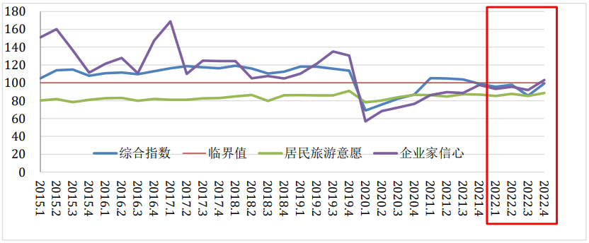 2022年疫情散发贯穿全年,各地防控措施竞相收紧,居民出游心态更趋谨慎。尽管11月11日优化疫情防控的“二十条”和12月7日疫情防控“新十条”,标志着全国疫情防控导向发生了根本变化,但是各地的感染高峰还是让政策翘尾效应失去了最后的窗口期。中国旅游研究院(文化和旅游部数据中心)专项监测表明:2022年全国旅游经济运行综合指数(CTA-TEP)位于临界值以下,1至4季度指数值分别为95.60、97.82、85.59和99.32,季度均值为94.58,较2021年低8.64。其中,居民出游意愿均值为86.73,与上年基本持平,而企业家信心指数则连续三个季度低于临界值。预计2022年全国国内旅游人数和国内旅游收入同比下降20-25%,恢复至疫前的四成左右。