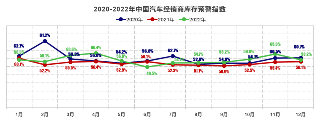 中国汽车流通协会发布的最新一期“中国汽车经销商库存预警指数调查”VIA(Vehicle Inventory Alert Index)显示,2022年12月中国汽车经销商库存预警指数为58.2%,同比上升2.1个百分点,环比下降7.1个百分点,库存预警指数位于荣枯线之上。