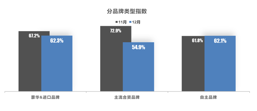 从分品牌类型指数看:12月进口&豪华品牌、主流合资品牌指数环比下降,自主品牌指数环比上升。