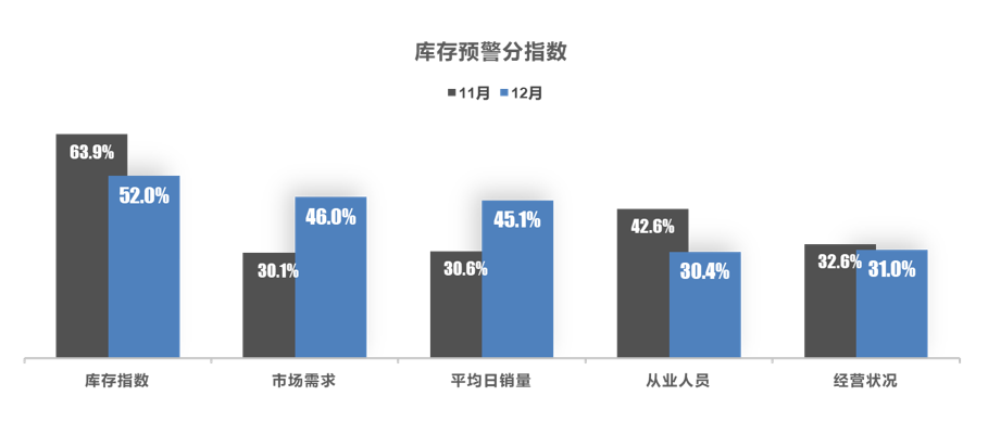 从分指数情况看:12月库存、从业人员、经营状况指数环比下降,市场需求、平均日销量指数环比上升。在短期疫情冲击下,经销商员工感染率较高,短期人员损失较大。