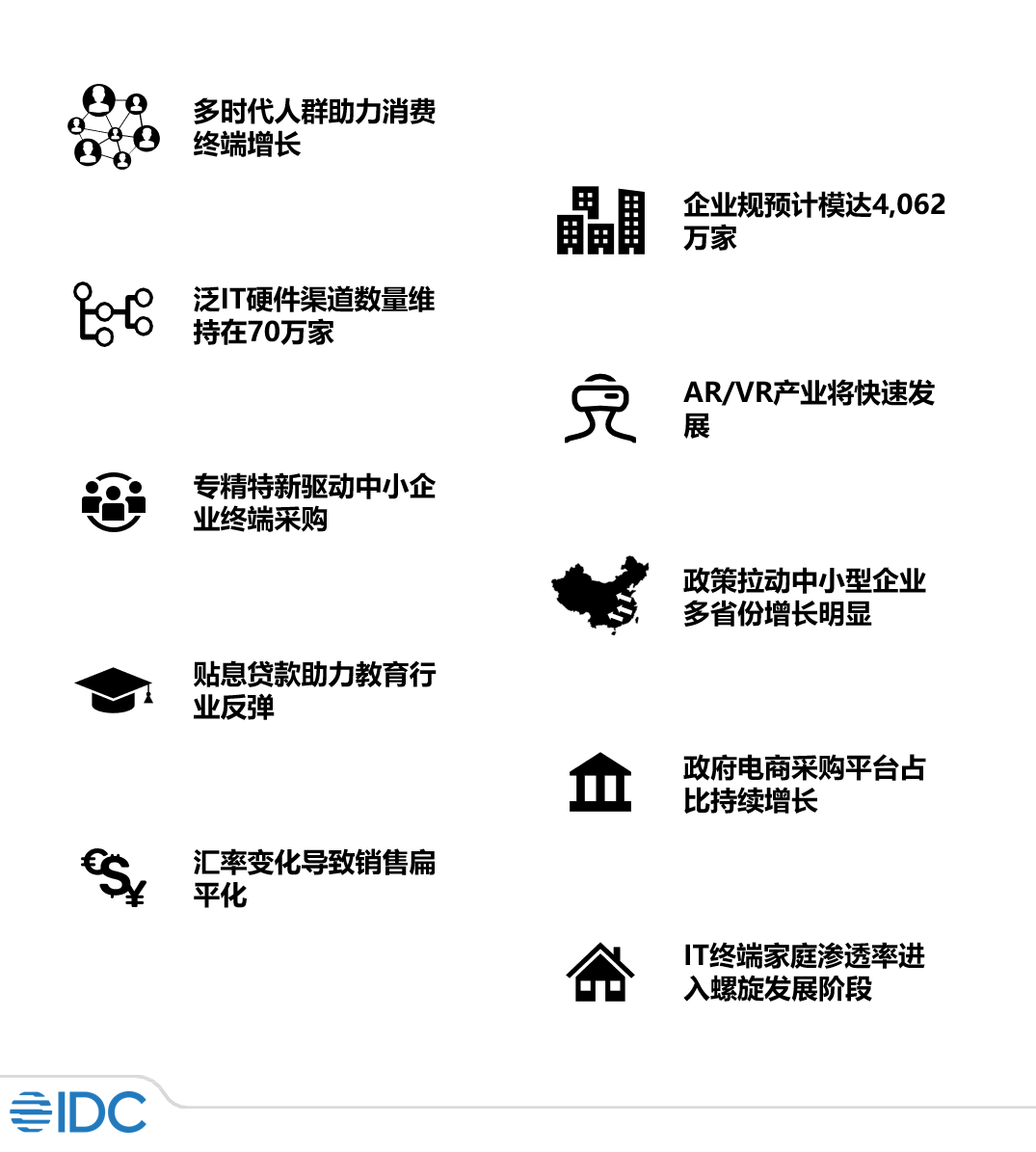2023 年中小企业在珠三角和长三角地区蓬勃发展的同时,各省份拉动内需继续向中小型企业提供优惠政策,将进一步强化地区优势,部分产业也将继续向其它省份转移。2023 年中小型企业需求在山东、四川、广西、安徽等省份 IT 终端需求增长明显。