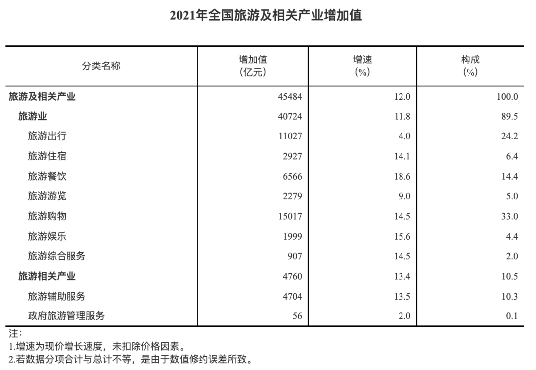 经核算,2021年全国旅游及相关产业增加值为45484亿元,比上年增长12.0%(未扣除价格因素,下同),占国内生产总值(GDP)的比重为3.96%,比上年下降0.05个百分点。