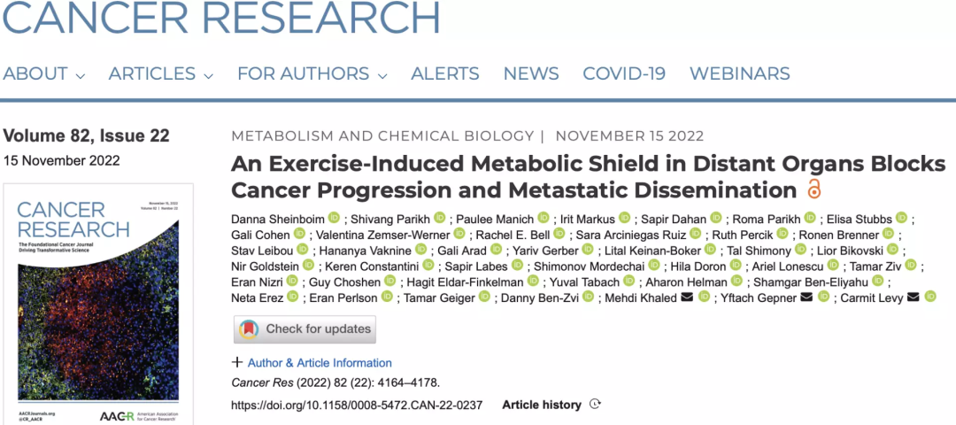 2022年11月15日,Cancer Research期刊上发表的An Exercise-Induced Metabolic Shield in Distant Organs Blocks Cancer Progression and Metastatic Dissemination的研究探明了“锻炼防癌”背后的潜在机制,并综合动物实验和临床观察得到结论——高强度运动能显著降低转移性癌症的风险!