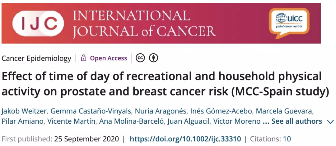 在International Journal of Cancer上刊登一篇Effect of time of day recreational and household physical activity on prostate and breast cancer risk (MCC-Spain study)的病例对照研究给出了“黄金抗癌运动时间”——早上8-10点锻炼,对乳腺癌和前列腺癌均有保护作用,两种患癌风险降低26-27%。