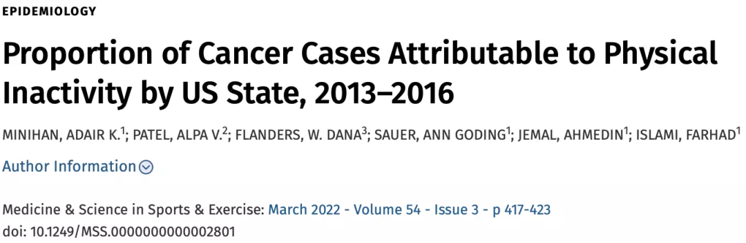 [6]MINIHAN, ADAIR K.1; PATEL, ALPA V.2; FLANDERS, W. DANA3; SAUER, ANN GODING1; JEMAL, AHMEDIN1; ISLAMI, FARHAD1. Proportion of Cancer Cases Attributable to Physical Inactivity by US State, 2013–2016. Medicine & Science in Sports & Exercise: March 2022 – Volume 54 – Issue 3 – p 417-423 doi: 10.1249/MSS.0000000000002801