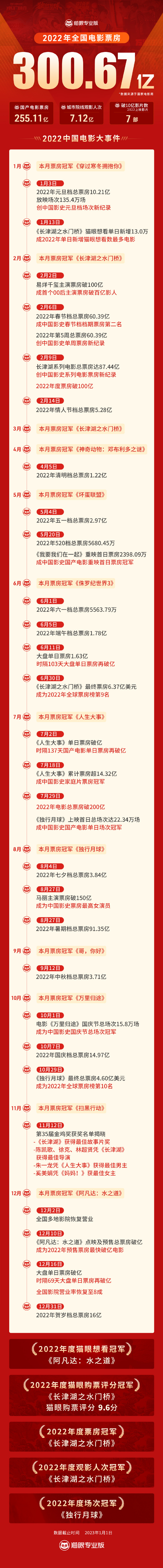 另据猫眼专业版数据显示,共有 7 部影片票房突破 10 亿元。2022 年度票房冠军为《长津湖之水门桥》,2022 年度观影人次冠军为《长津湖之水门桥》,2022 年度场次冠军为《独行月球》。