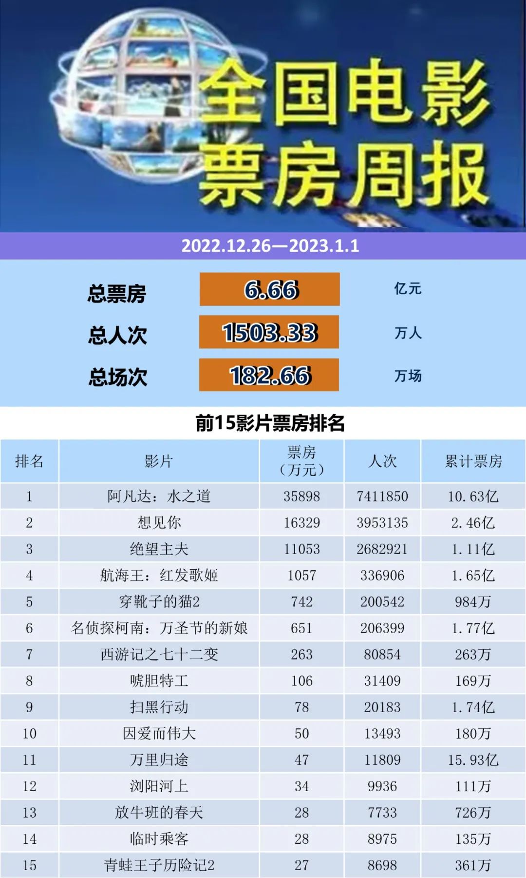电资办:2022年12月26日-2023年1月1日全国电影票房周报 更多阅读:电资办:2022年11月14-20日全国电影票房周报电资办:2024年5月27日-6月2日全国电影票房周报电资办:2024年9月30日-10月6日全国电影票房周报电资办:2023年8月21-27日全国电影票房周报电资办:2023年9月4-12日全国电影票房周报电资办:2023年7月3日-7月9日全国电影票房周报电资办:2023年8月7-13日全国电影票房周报电资办:2023年1月30日-2月5日全国电影票房周报电资办:2023年2月20-26日全国电影票房周报电资办:2023年1月9-15日全国电影票房周报电资办:2022年1月16-22日全国电影票房周报电资办:2022年1月2-8日全国电影票房周报电资办:2022年12月12-18日全国电影票房周报电资办:2022年12月5-11日全国电影票房周报电资办:2023年6月5-11日全国电影票房周报