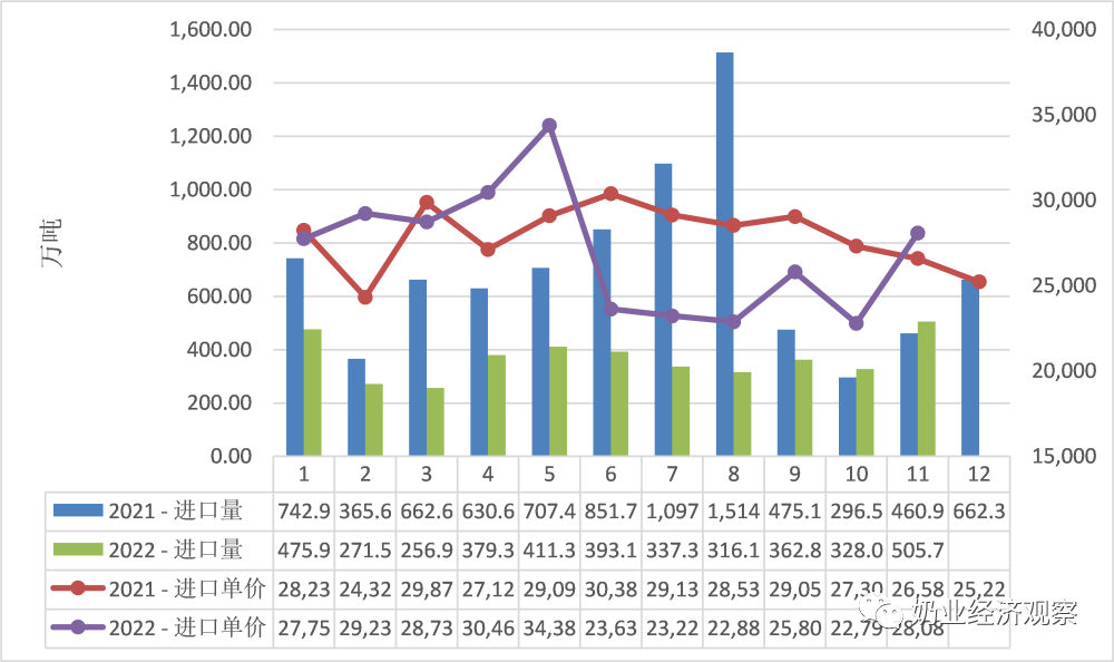 Figure3‑1中国婴幼儿配方奶粉月度进口量及价格2021-2022