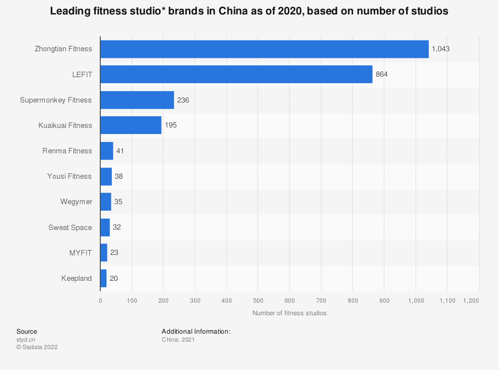 截至2021年,中天健身在中国的线下健身工作室从671家增加到1043家。与其最接近的国内竞争对手LEFIT拥有864家门店,高于去年的595家。除了传统的健身房或健身俱乐部,健身工作室为会员提供个性化的训练计划。