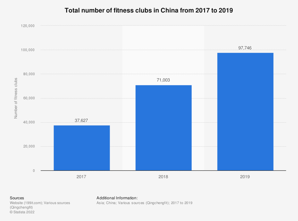 2017-2019年中国健身俱乐部总数 数据来源:Statista.com