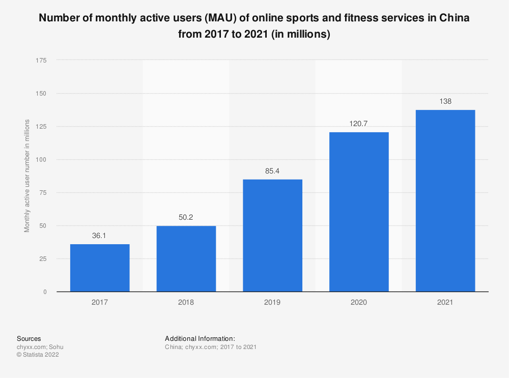 2017- 2021年中国在线运动健身服务月活跃用户数(MAU)(百万) 数据来源:Statista.com