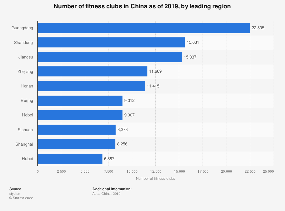 截至2019年,中国各主要地区的健身俱乐部数量 数据来源:Statista.com